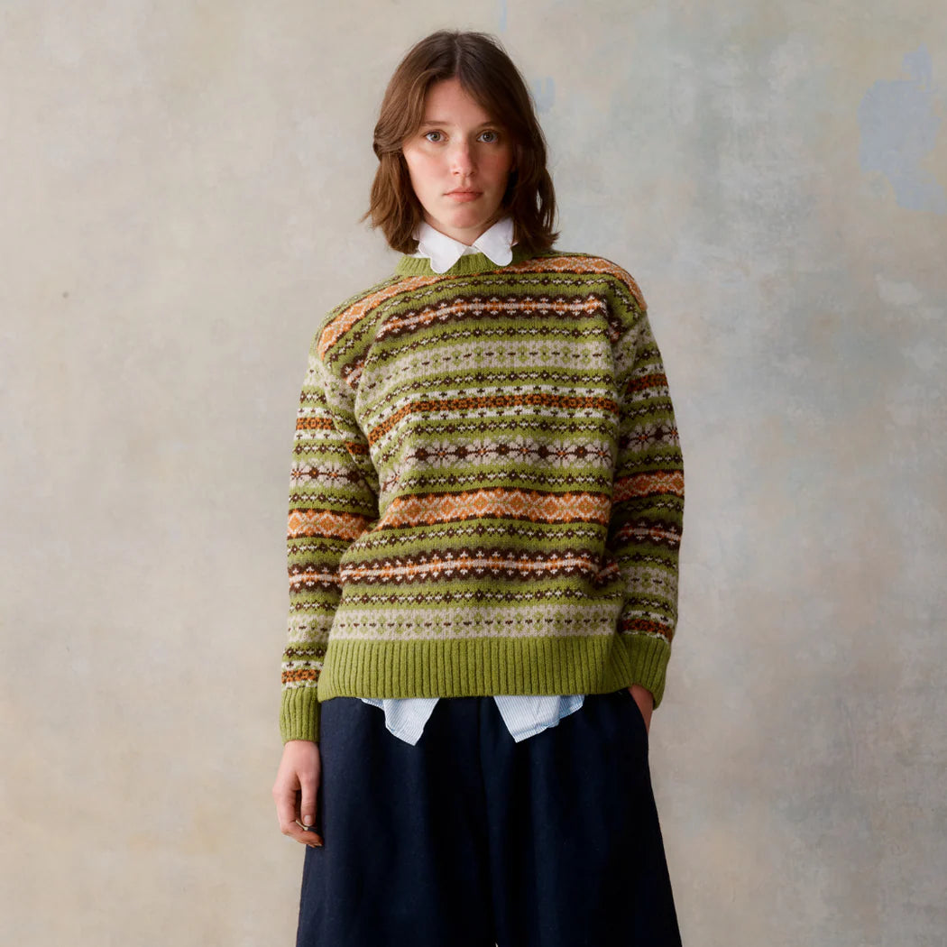Jo Gordon believes in knitwear made with honesty and purpose. For her, wool is more than material - it is resilient, functional, and deeply rooted in Scotland’s long history of knitmaking. Since launching her brand in 1995, Jo has worked closely with mills that share her respect for traditional craftsmanship and the authenticity that comes with small-scale making. Many of these manufacturers are modest in size but large in skill; their commitment to heritage and quality is central to every piece they produce. Using 100% lambswool spun in Scotland and dyed with organic or certified-sustainably sourced dyes, Jo's pieces are often defined by bold stripes, checks, spots, diamonds, colour blocks and zigzags, in vibrant and joyful colours.