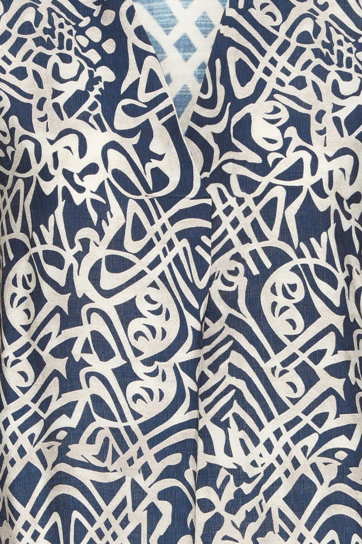 Long sleeve patterned blouse with structured straight fit and open collar. Button-up front. Lightweight texture and hip-length silhouette for a modern statement.