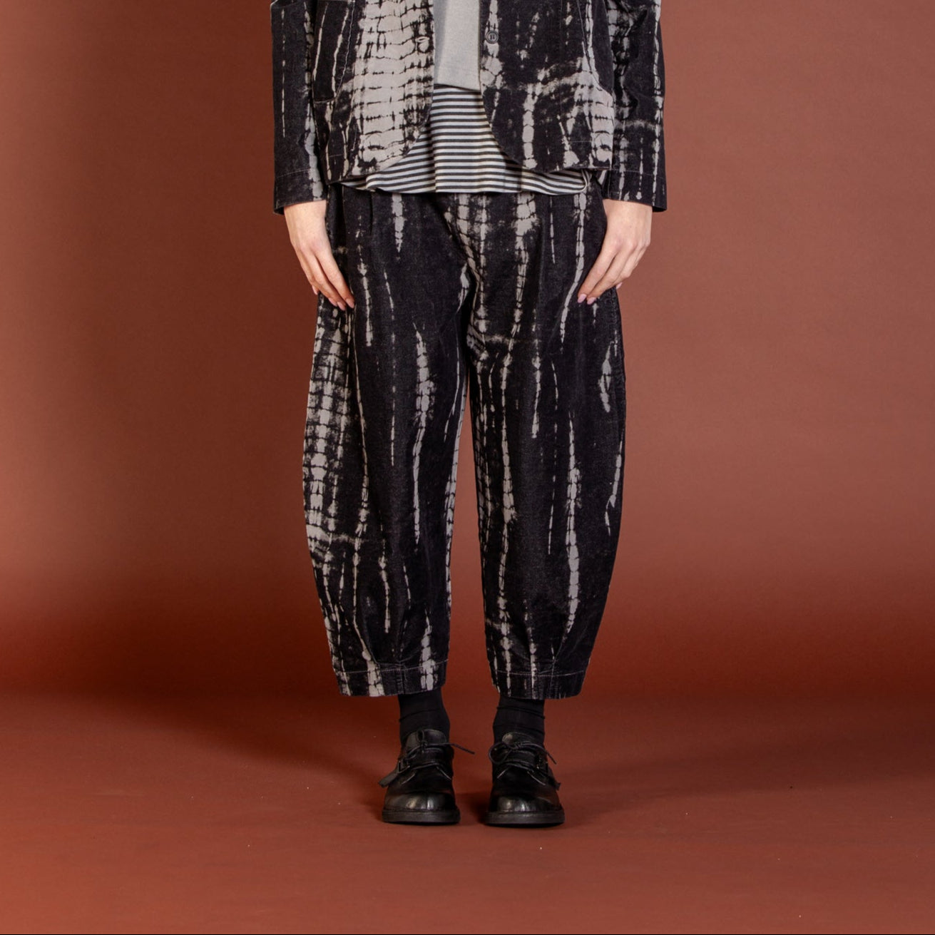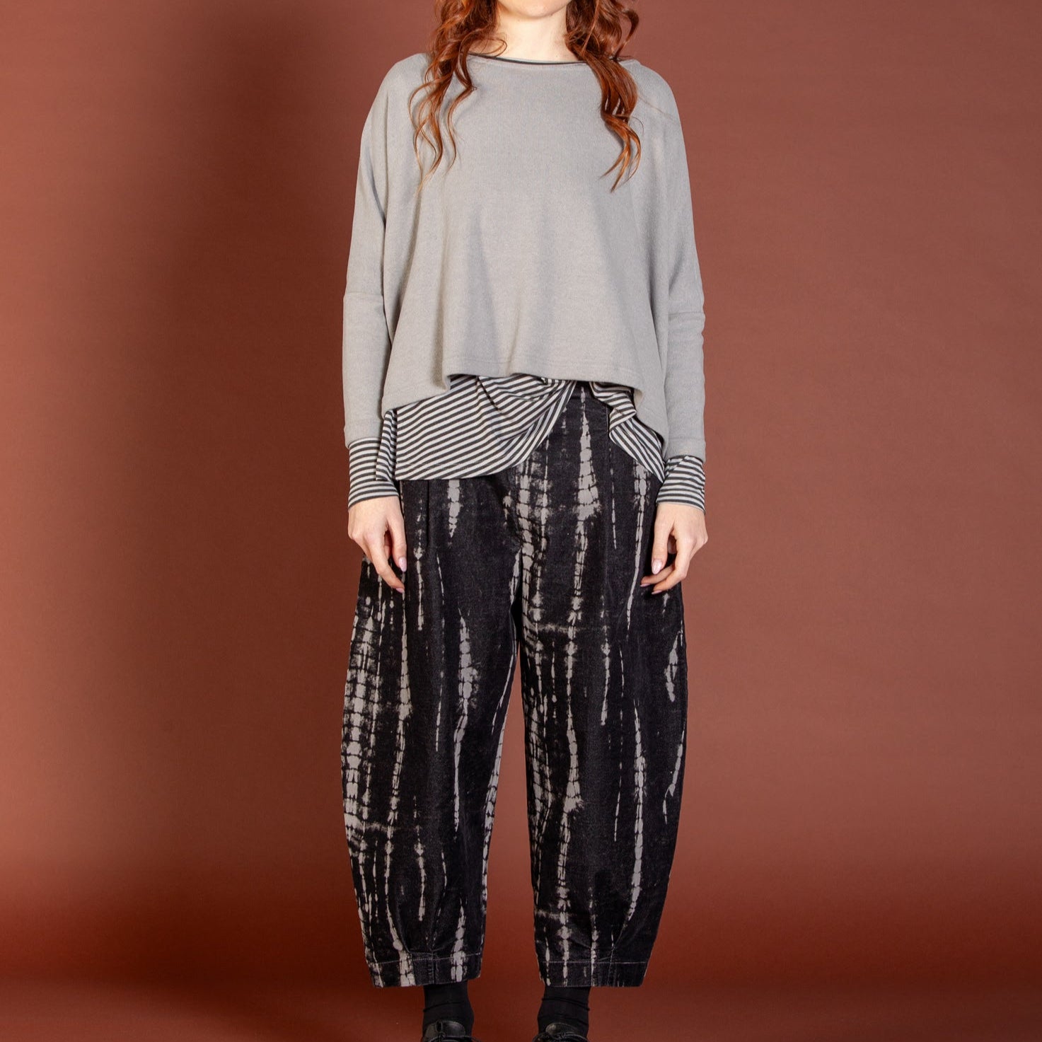 These velvet printed trouser by Mama B are their signature cropped bubble silhouette with tapered leg. The trousers feature cuffed hems, side pockets and flattering pleat detailing.