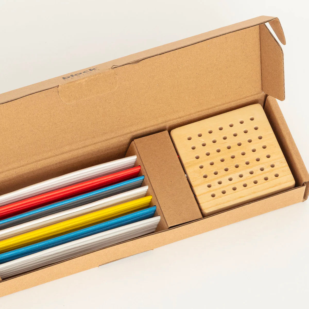 Enjoy creating different patterns with the coloured sticks, inspired by an iconic modernist palette.