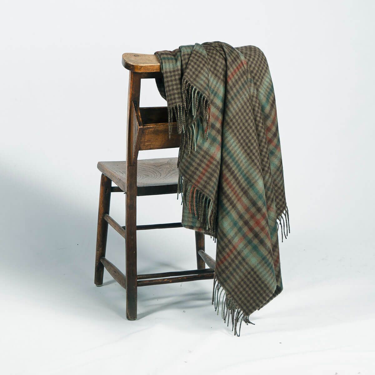 The Forth Weathered Lambswool Blanket is a glen check design which has a muted brown base with teal, duckegg, purple and red overchecks.