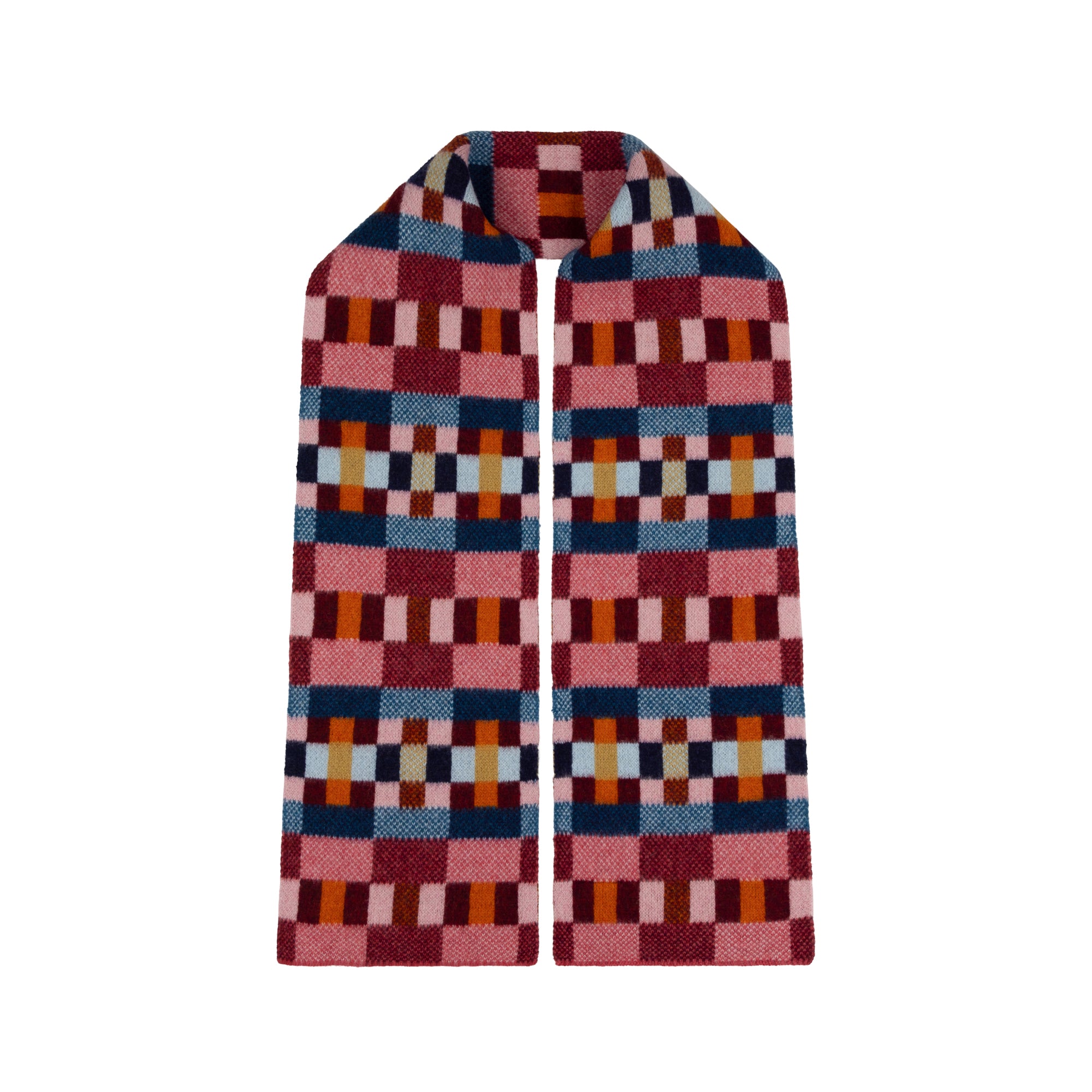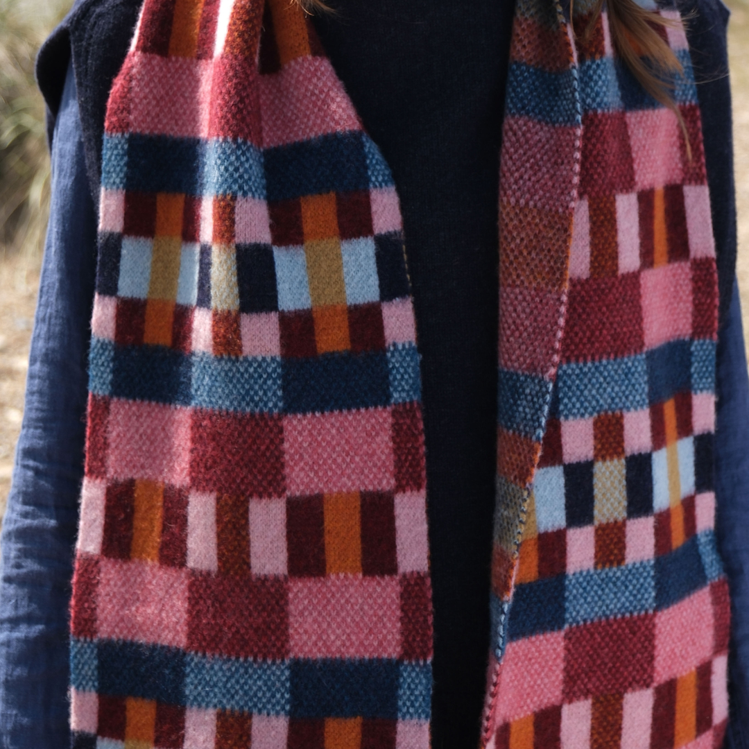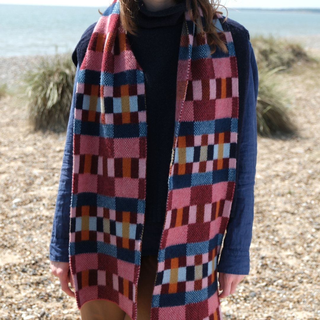 This statement piece has a small but dynamic block design on one side and a softer blurred version on the reverse, ensuring it is super versatile. Perfect for dopamine dressing, this fresh new design will cheer those grey winter days. The wool is brushed and lightly felted for extra softness and warmth.