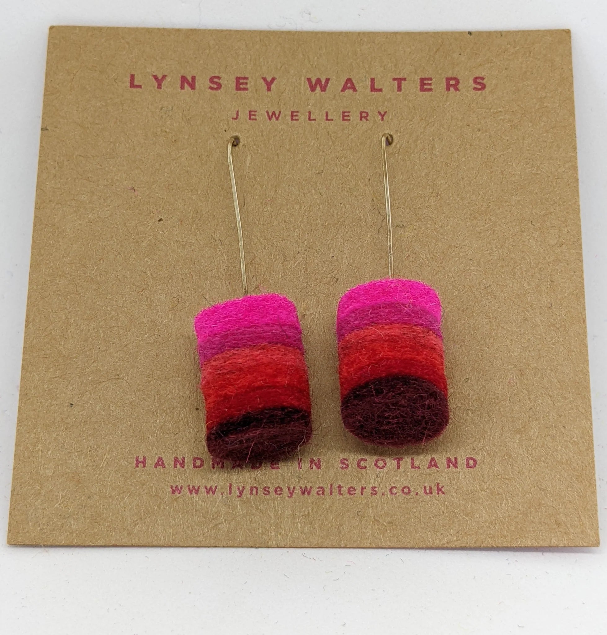 A little ombre felt striped cylinder on a sterling silver wire hook.