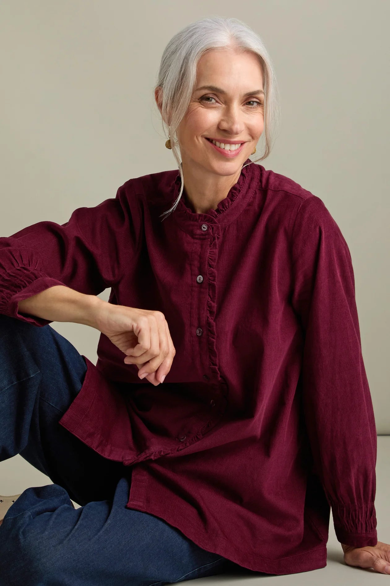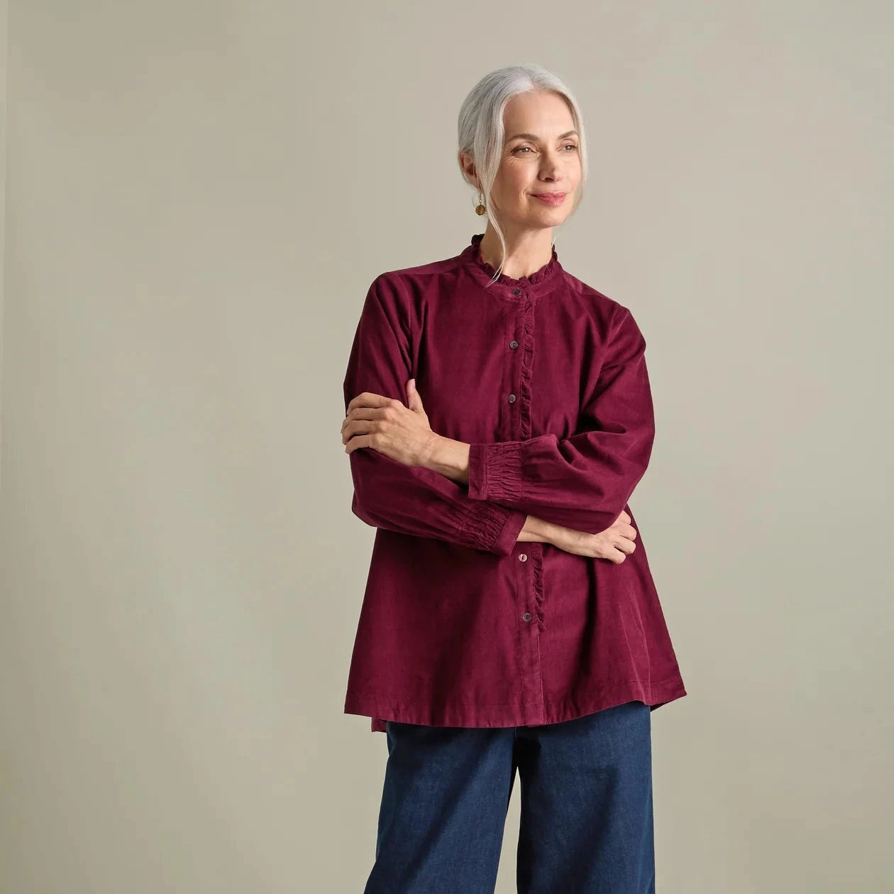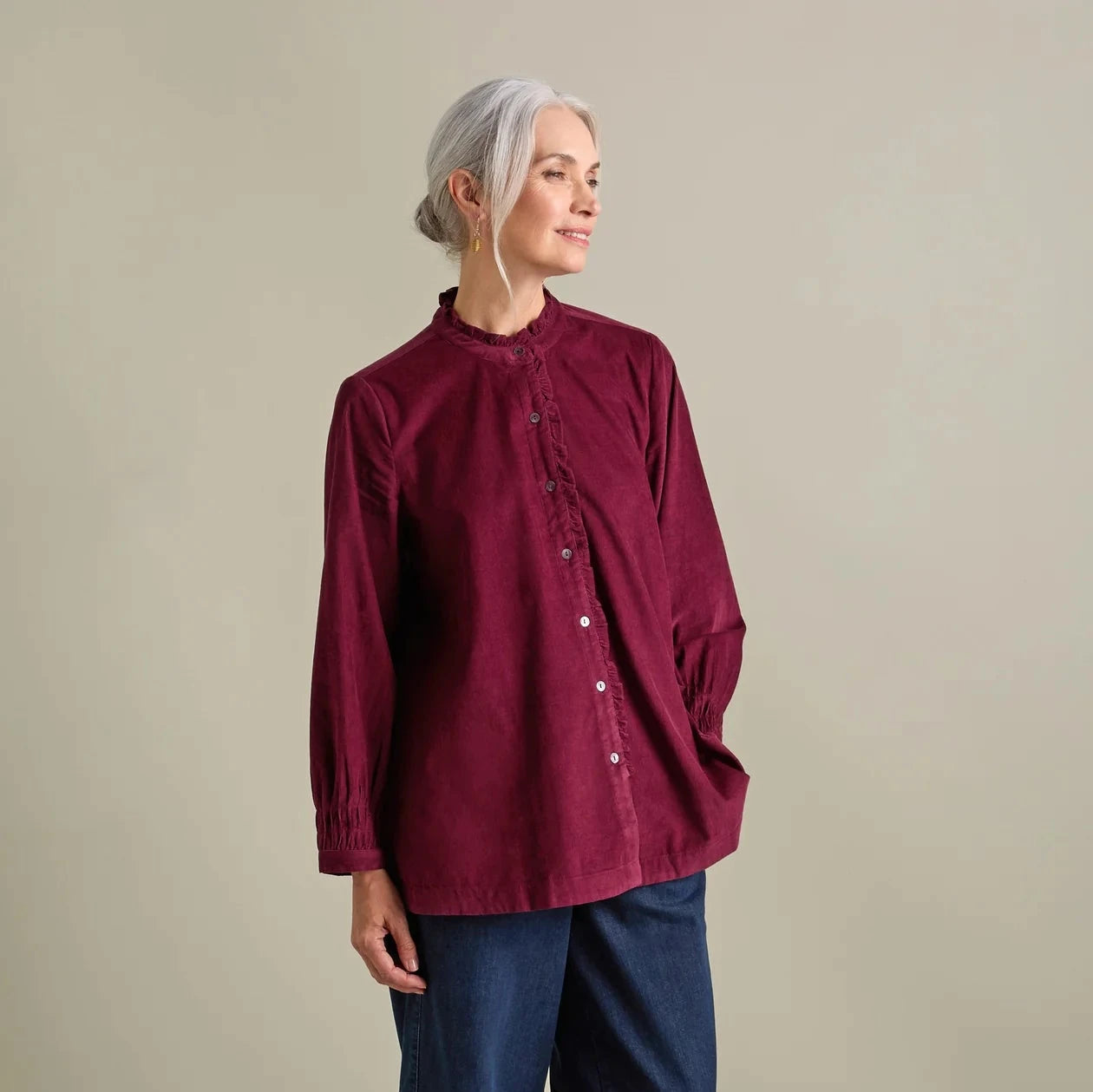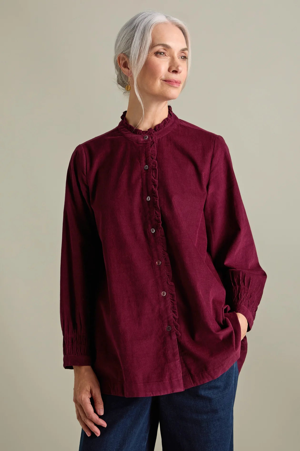 The grandad collar is enhanced with delicate frill detailing and a button-down placket, with full sleeves, while the curved hem creates a flattering silhouette that’s perfect for tucking in or wearing loose.