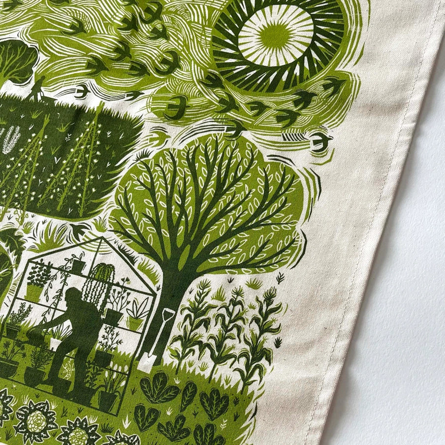 - Screenprinted in two shades of luscious sap green ink - Packaged with a cardboard belly band The soft cotton works great to dry your dishes, and looks lovely hung in your kitchen too!