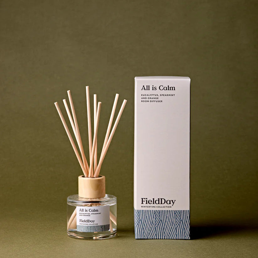 'All is Calm' Diffuser in a glass jar with wooden cap and unbleached reeds, with fragrance notes of Eucalyptus, Spearmint and Orange.