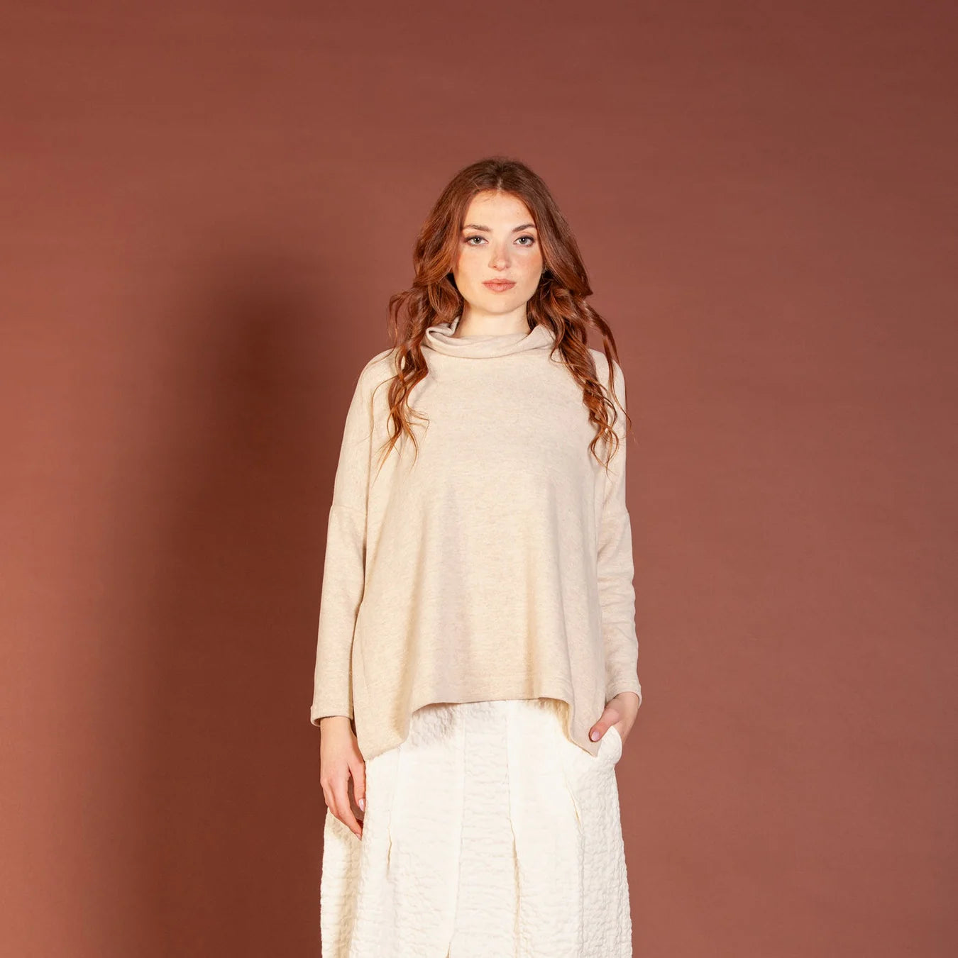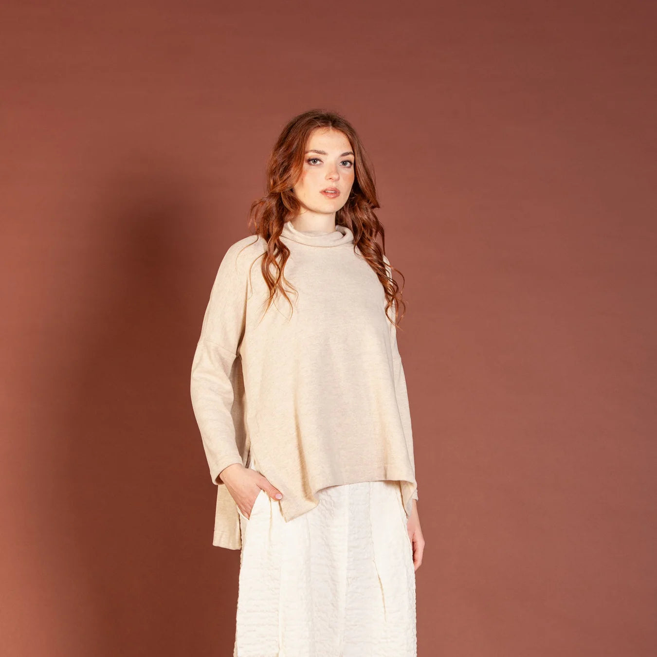 A relaxed fit, easy to wear jumper by Mama B. With a loose roll neck, side splits and long sleeves, finished in a fleece cotton fabric, this is the perfect cosy autumn staple.