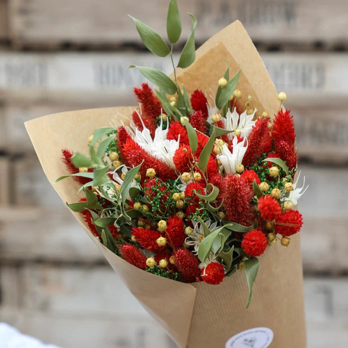 Each bouquet is handcrafted using a selection of long-lasting, low-maintenance dried flowers, then finished in natural kraft paper for a rustic, premium presentation.