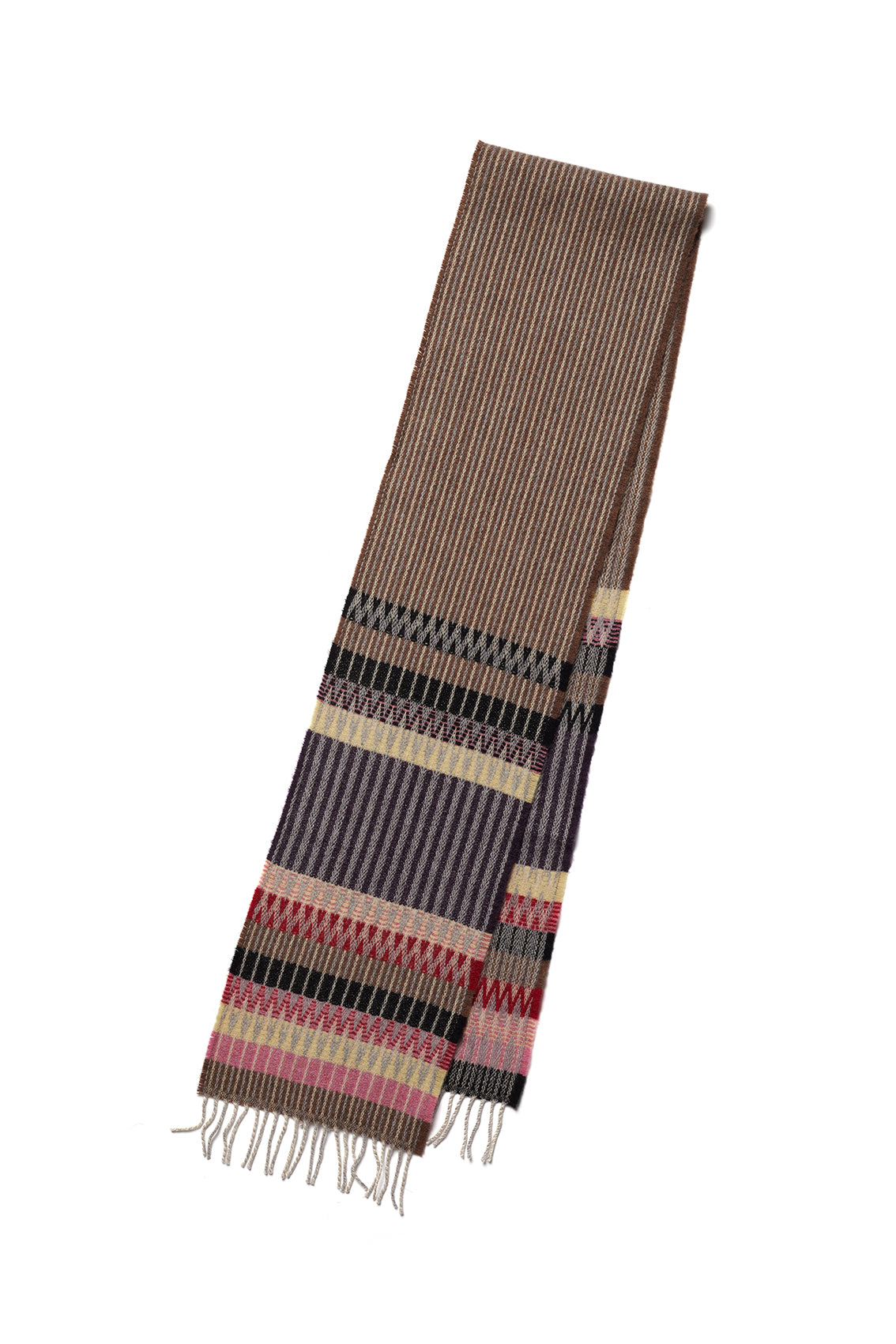 This woody, rustic scarf, with contrasting zigzags in fresh and flowery powder pink and pollen yellow, is bookended by deep tones of black and berry.