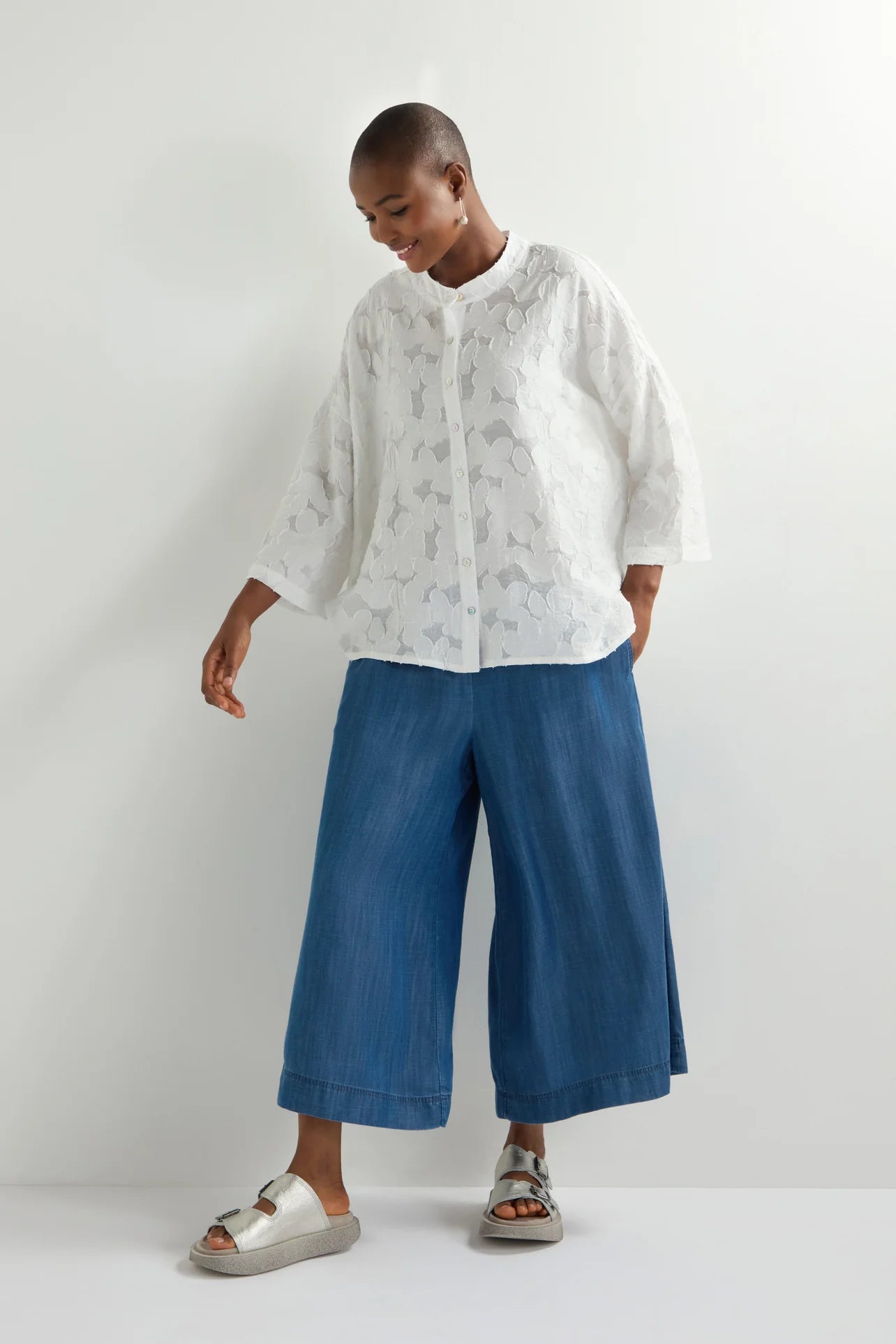 Featuring a mandarin collar with a front button fastening adorned with lustrous shell buttons, this shirt exudes understated sophistication. Thoughtfully designed with side splits for ease of movement and bracelet-length sleeves for a graceful touch, it’s perfect for layering or wearing solo. Pair it with wide-leg trousers for an effortlessly chic ensemble.