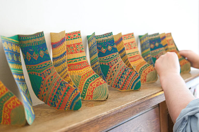 Patterned stockings make up this concertina garland, perfect for decorating a festive mantelpiece or table.
