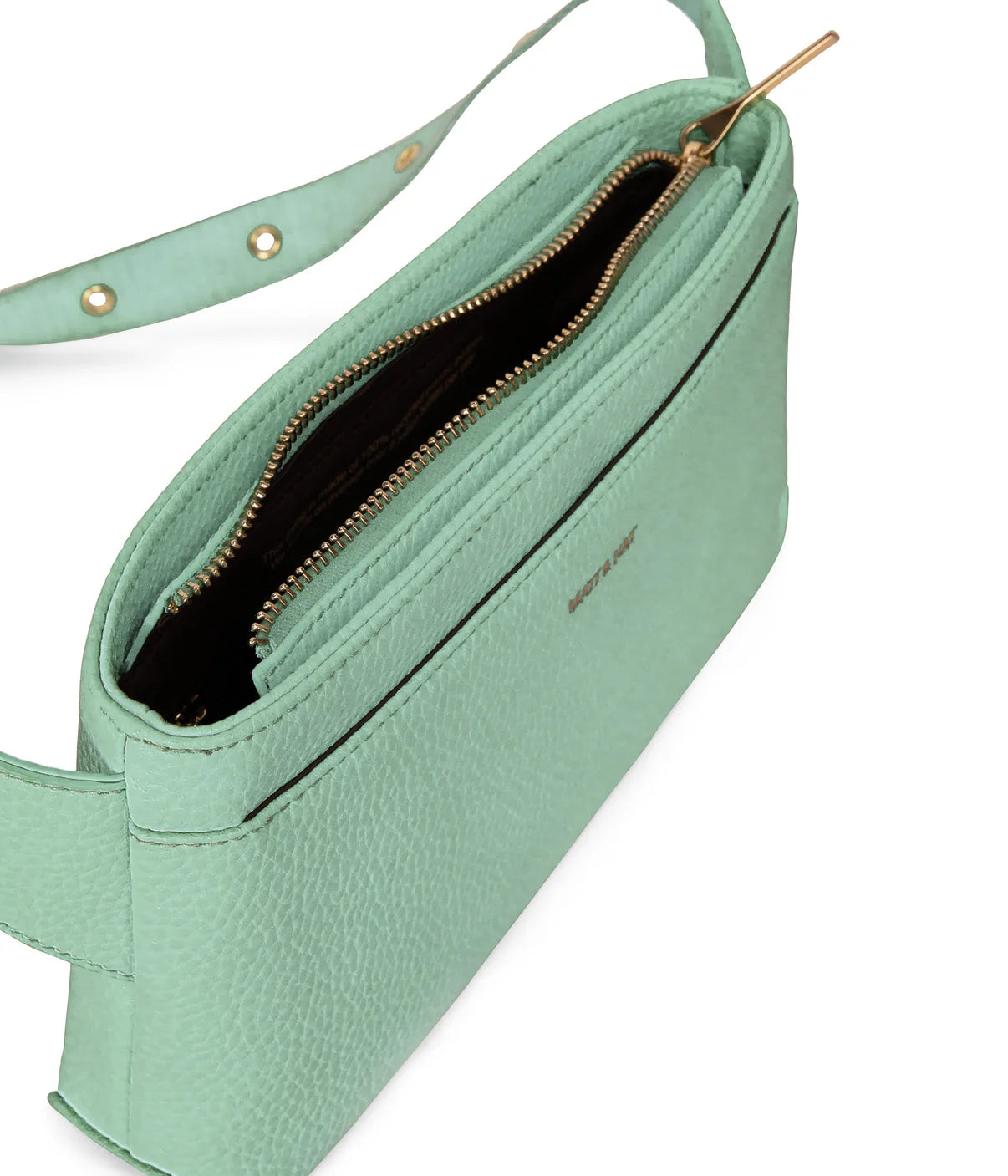 Belt bag with a zippered main compartment and a front slip pocket with a press snap closure. Buckle belt strap for comfortable wear around the waist or across the chest. The front pocket can fit a large smartphone.