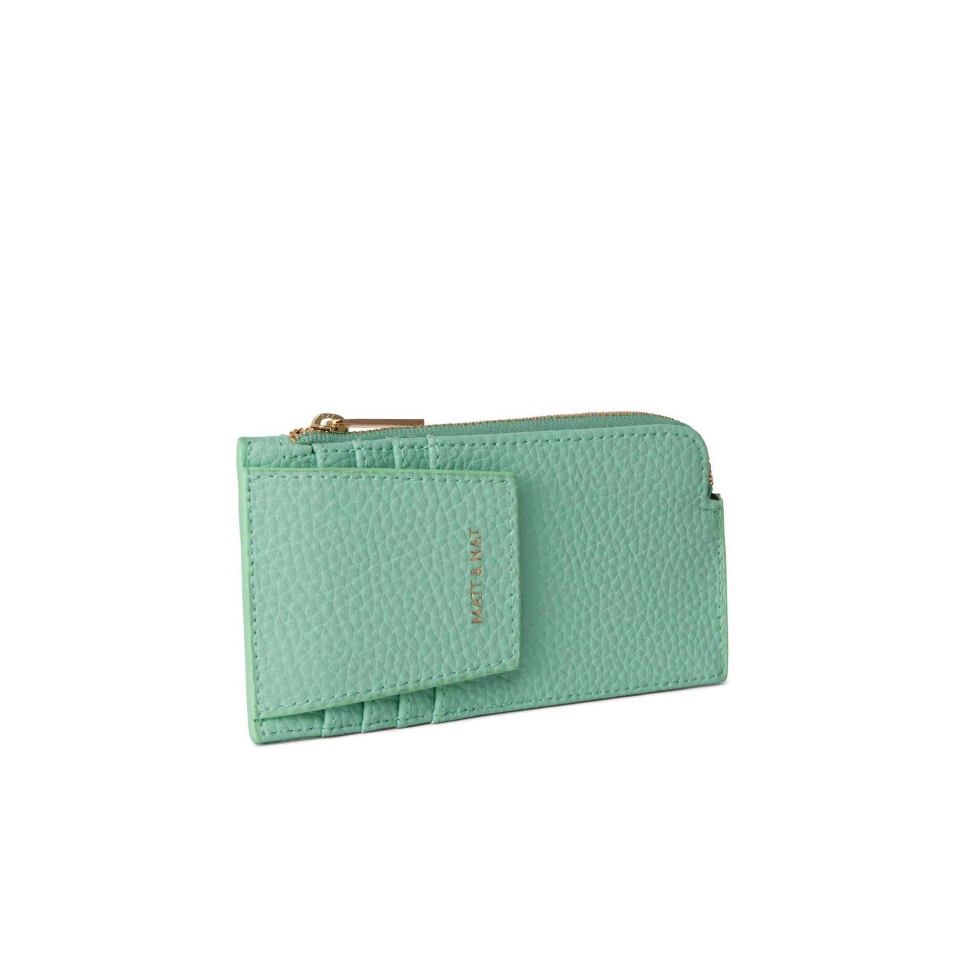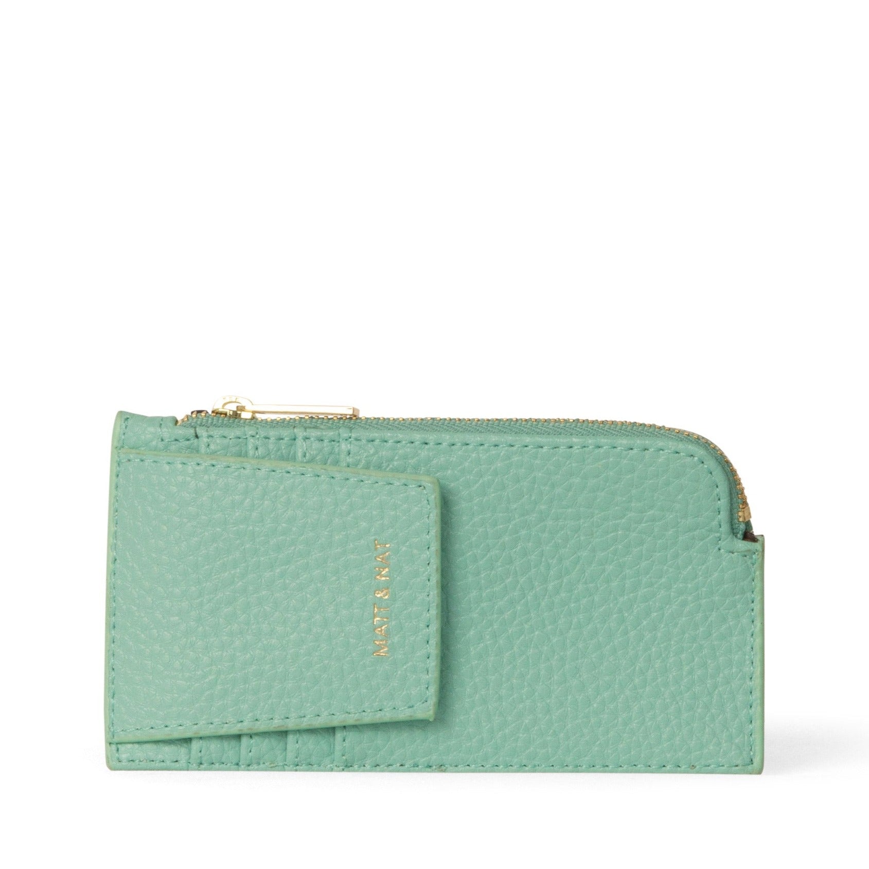 Cardholder with zip coin pocket, 4 card slots with a flap and snap closure, and a slip pocket at exterior back.