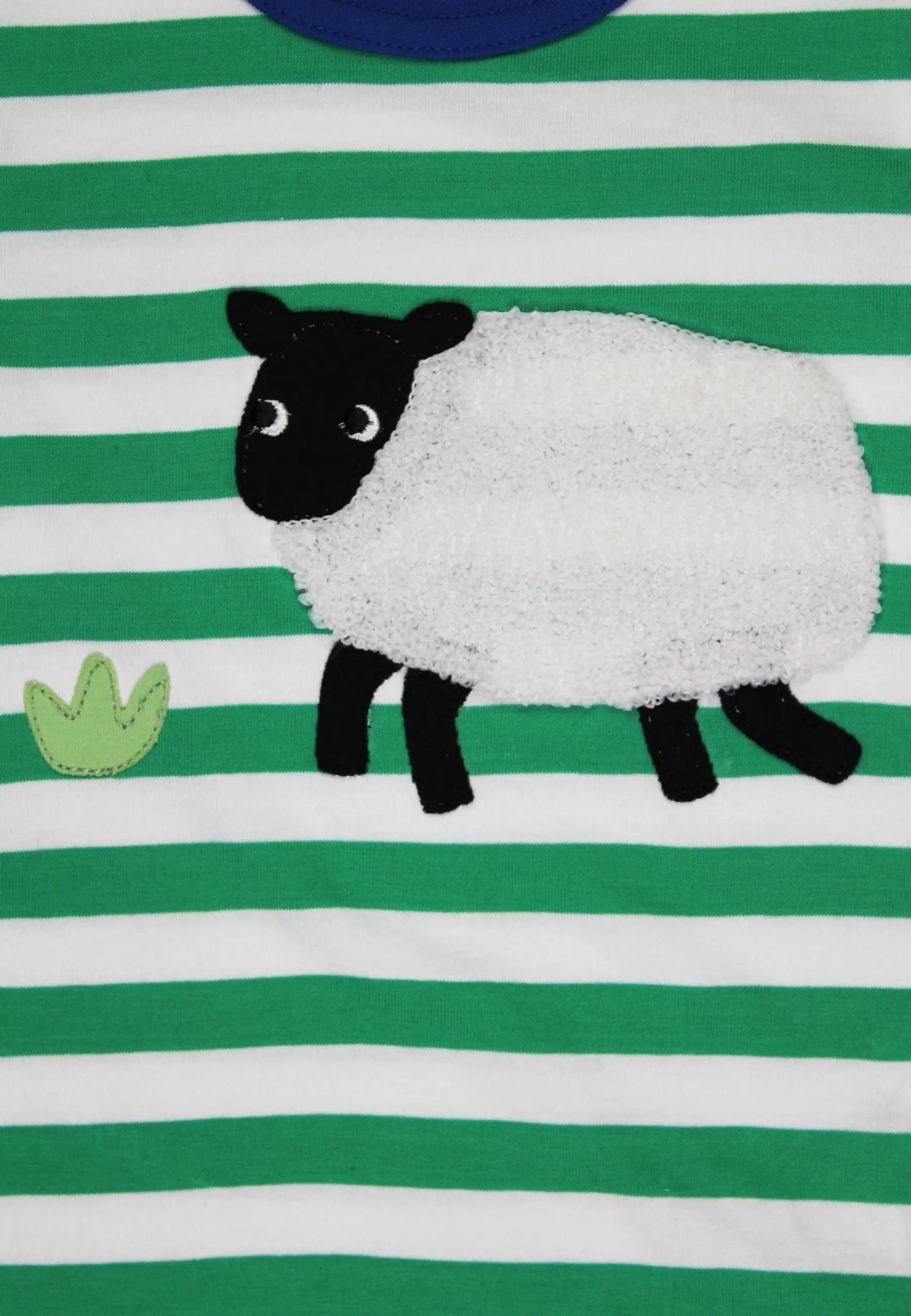 Say hello to our playful Organic Hillside Sheep Applique Short Sleeved T-Shirt! Made from 100% organic cotton and featuring a fluffy sheep applique on the front (and two on the back!), this green and white striped jersey t-shirt is perfect for ages 6 months to 6 years. Part of our Hillside Walk collection.