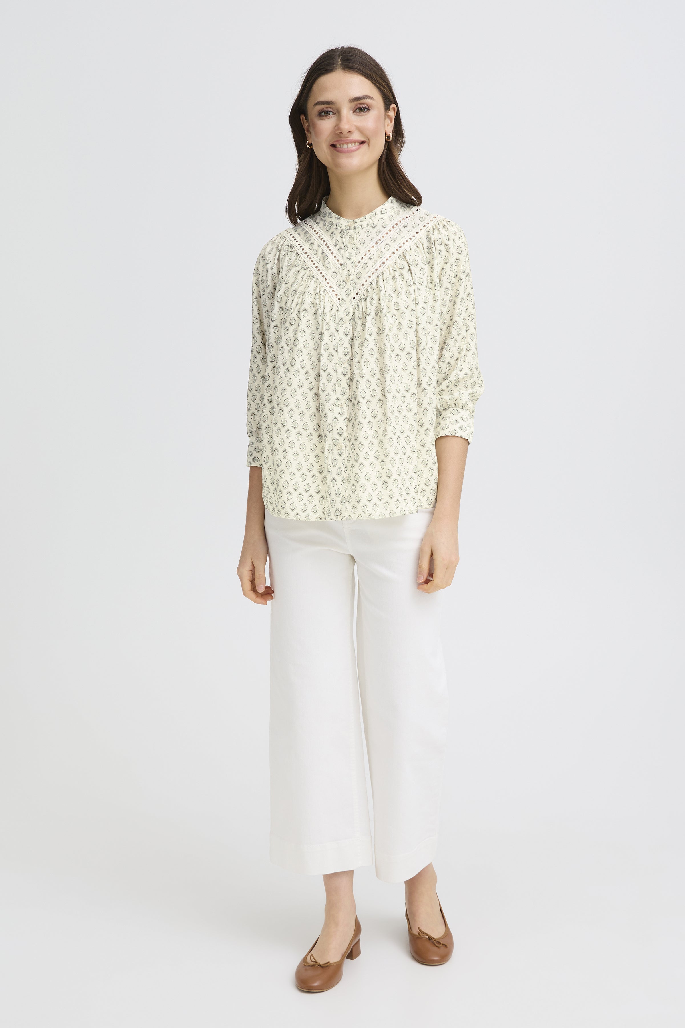 Blouse with relaxed silhouette, round neckline and three-quarter length sleeves. Features panel and lace trim details at front.