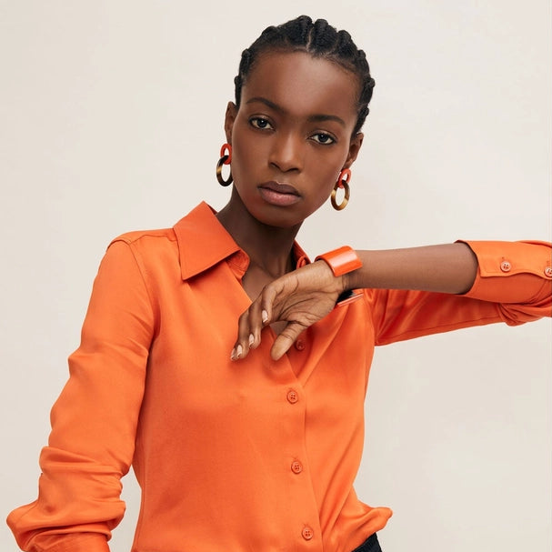 These stunning small oval buffalo horn link earrings in orange are a must-have for any jewelry collection. Crafted from ethically sourced natural buffalo horn, which is a bi-product from the farming industry, each pair is unique with its own color variations. The lacquered orange and brown links create a modern statement piece that is lightweight and comfortable to wear. Finished with a hyperallergic stainless steel ear post, these earrings are perfect for any occasion.