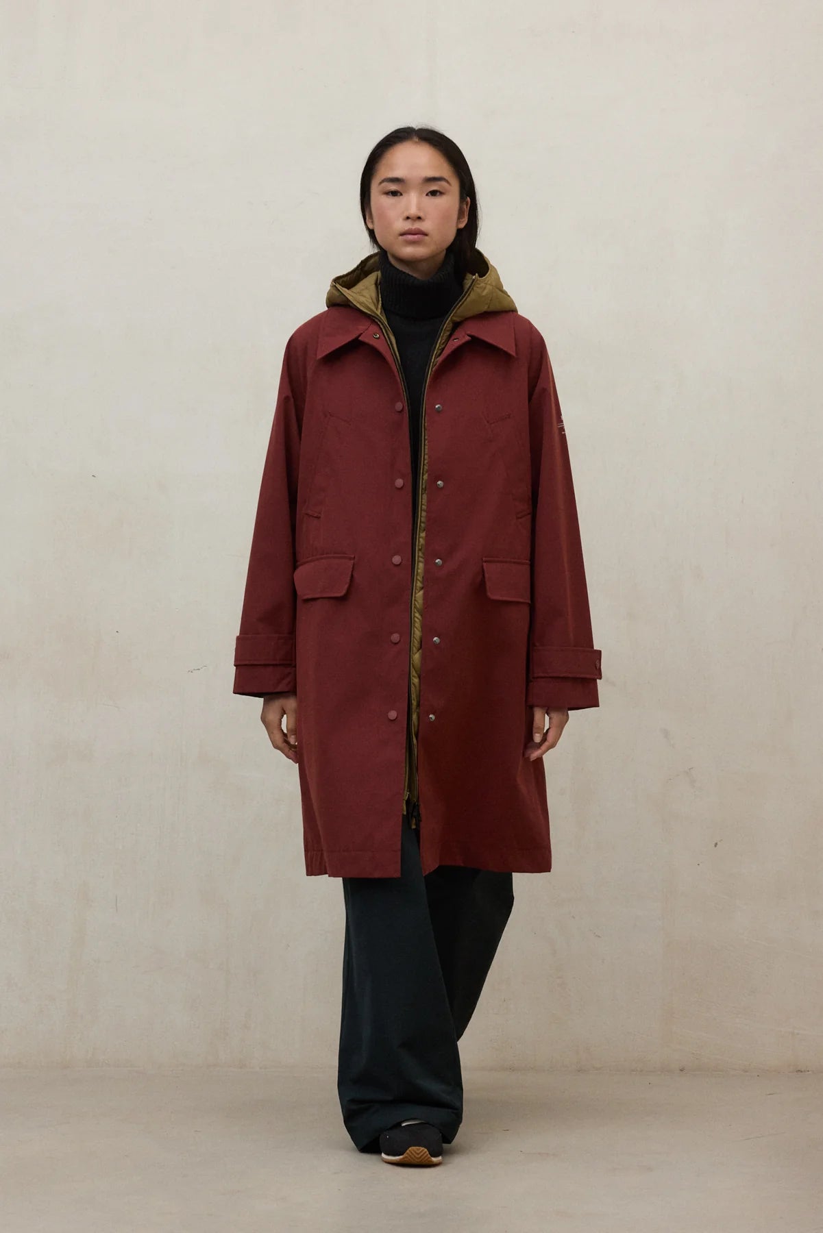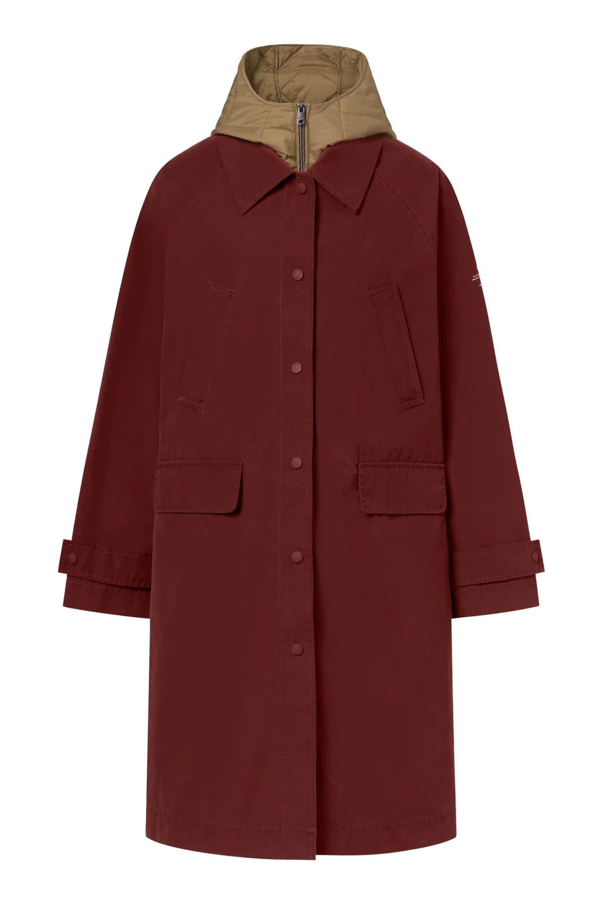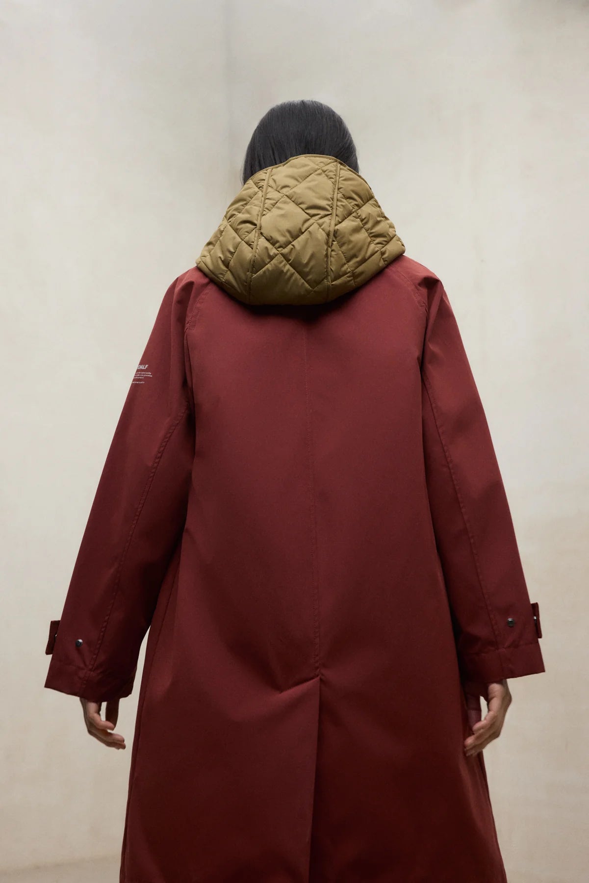 The Hyden coat is made of 54% recycled polyester, 46% organic cotton lining and 100% recycled polyester filling. Recycled polyester cuts down on the use of fossil resources, CO2 emissions, and water and energy consumption by reusing plastic waste such as PET bottles, while maintaining the properties of virgin polyester. This innovative design blends the sophistication of a trench coat and the warmth of a padded vest for a functional yet modern look.