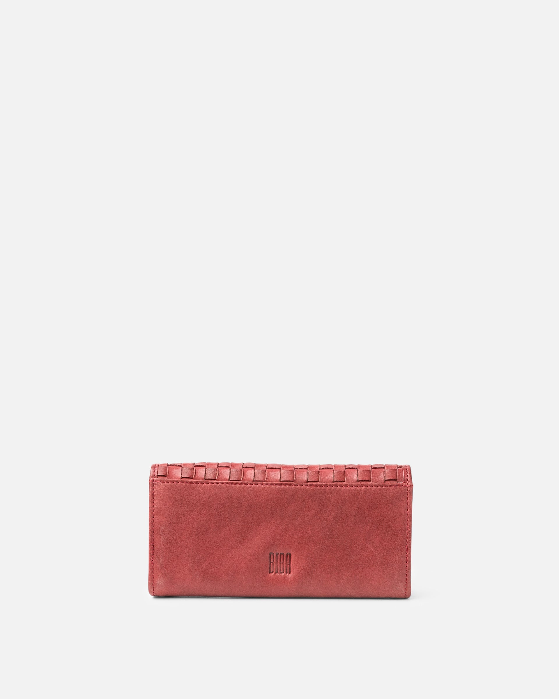 Washed, vegetable-tanned, hand-braided cowhide leather large wallet. Flap-button closure, compartments for cards, bills and coins.