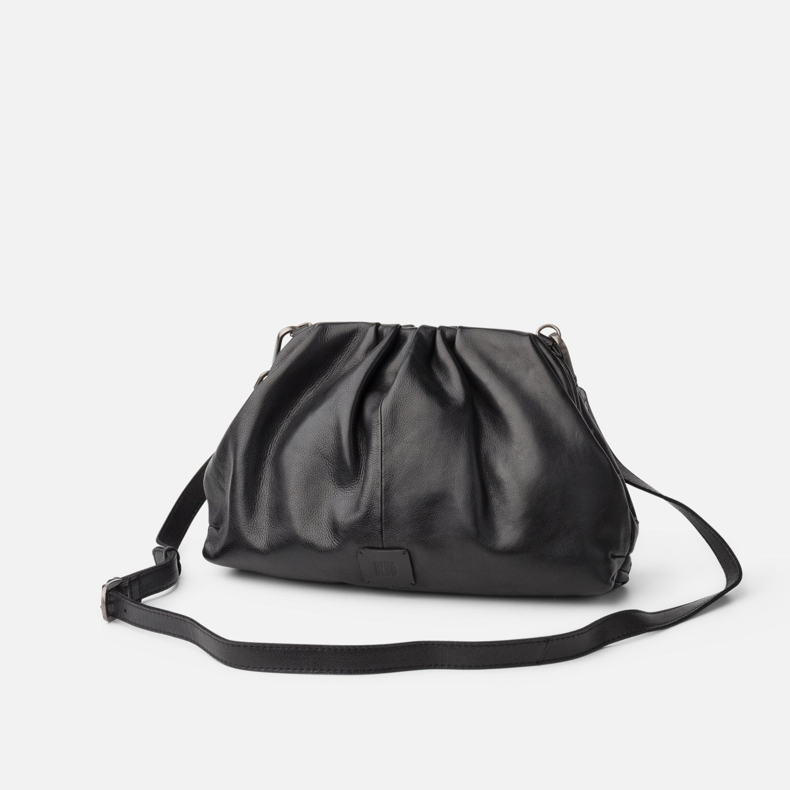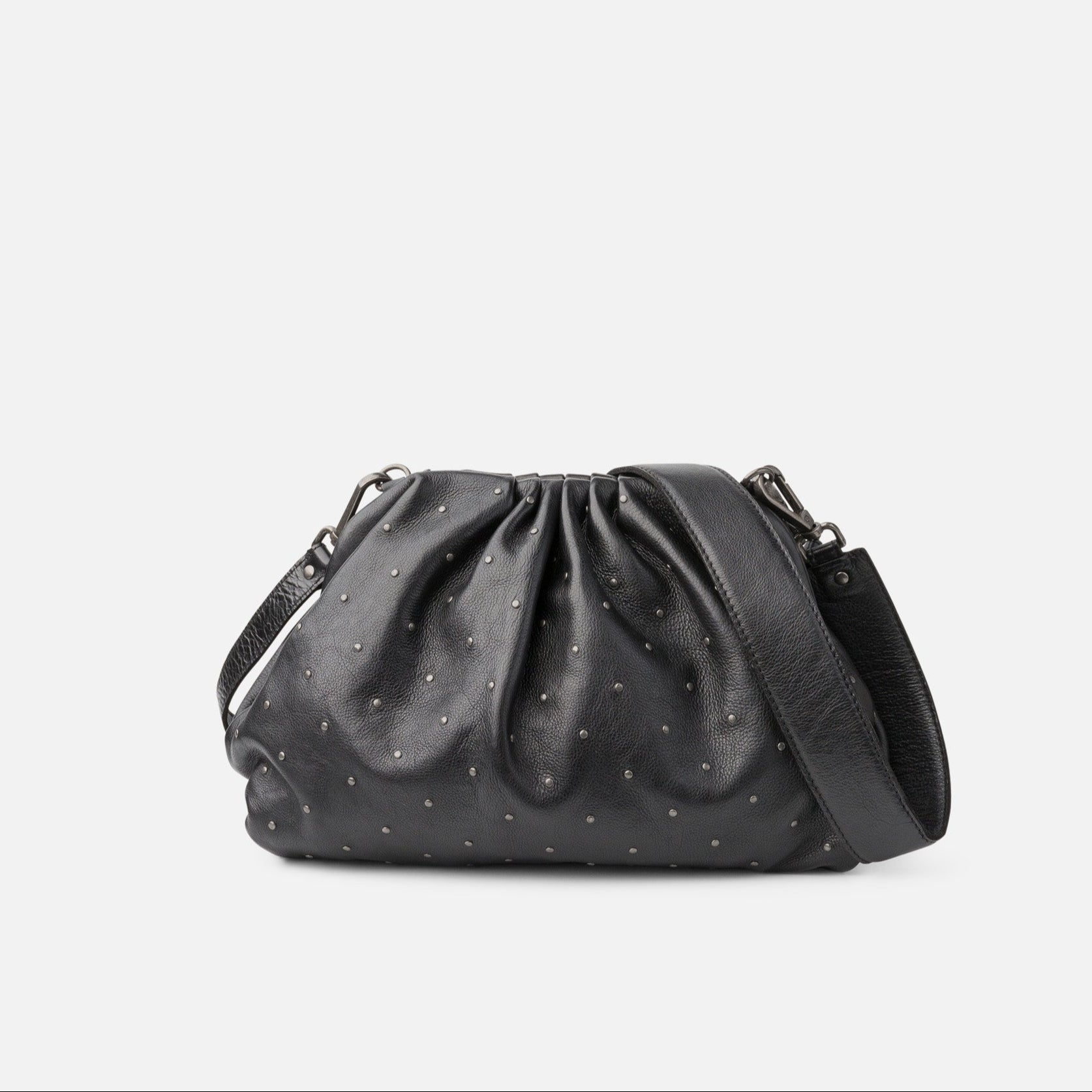 Washed cowhide crossbody bag. Frontal decoration with small studs. Magnetic closure. Removable shoulder strap. Adjustable and removable shoulder strap. Internal pockets. Cotton lining.