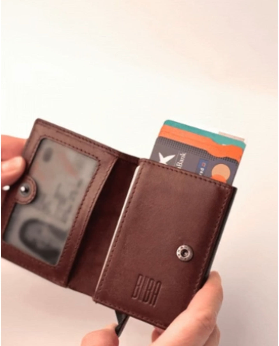 Wallet with automatic (pop-up) system for cards, and compartment for bills and ID. RFID security system.