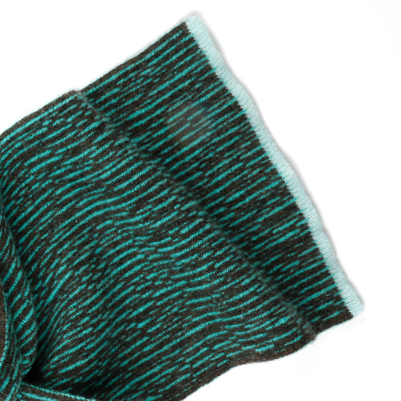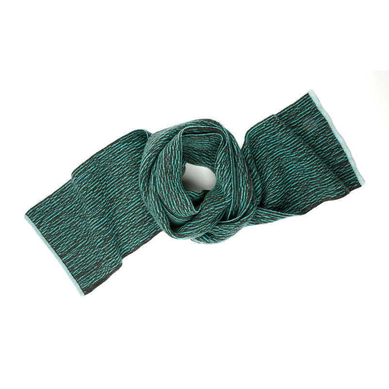 Cocoa and mint with pale aqua end details. This subtle striped scarf has been knitted with 100% luxury soft lambswool. Each item is hand produced on an industrial knitting machine and hand finished to create fine details and excellent quality.