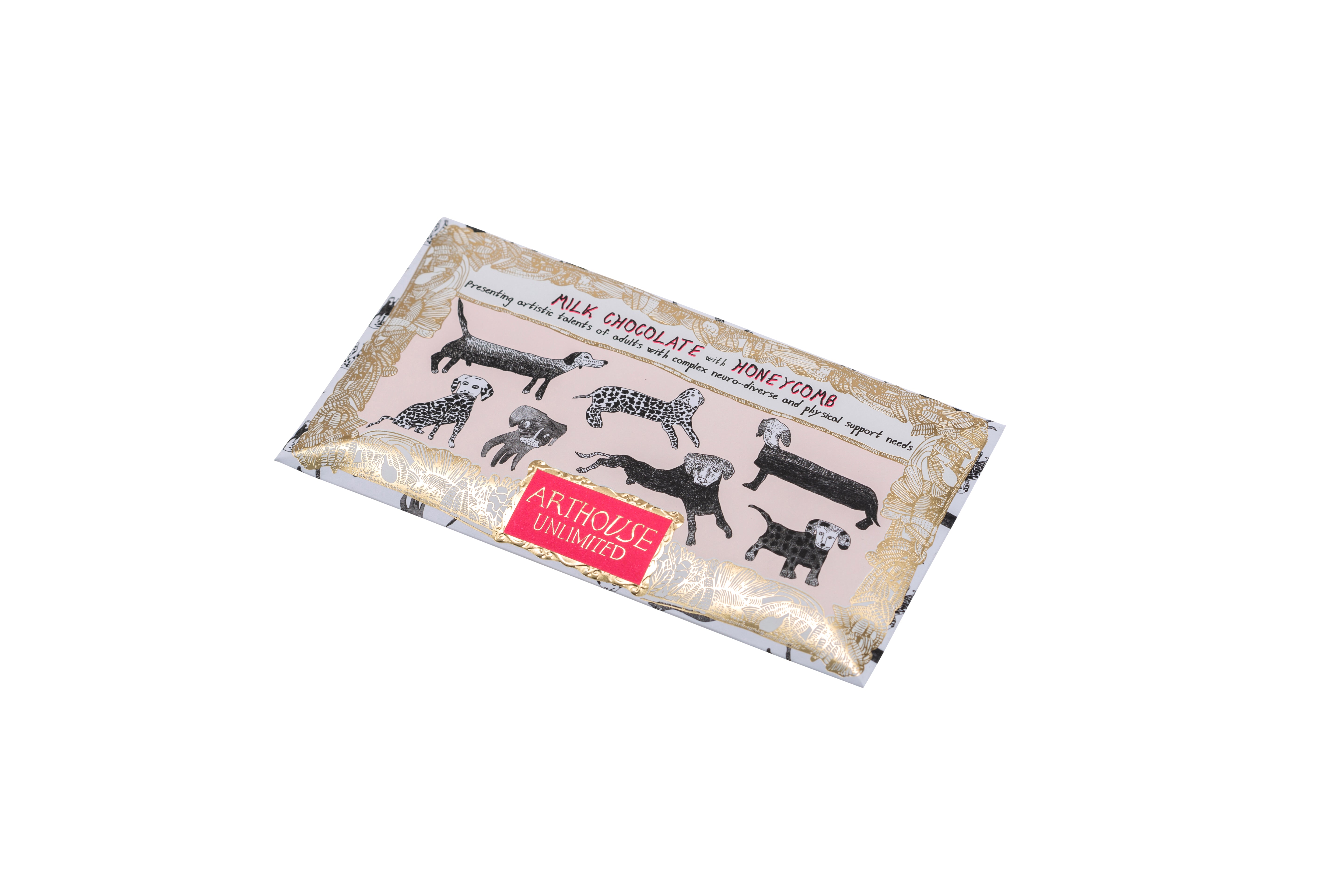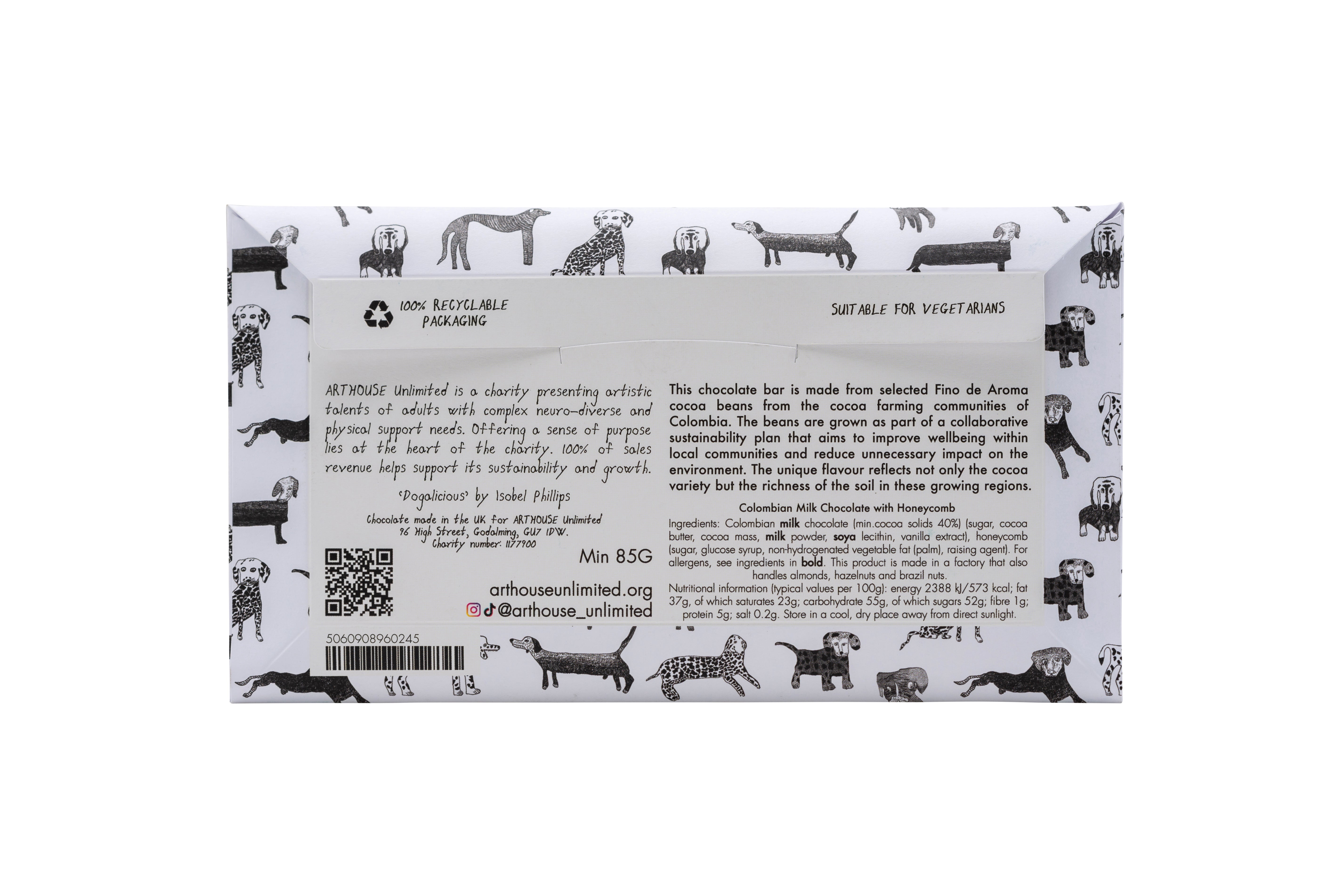Featuring artwork created by artist & dog fan Isobel Phillips, this mouth-watering milk chocolate with honeycomb chocolate bar is made in the UK with responsibly sourced single origin cocoa. Wrapped in coloured foil & encased in a recyclable envelope, Isobel's dogalicious artwork is presented in a shimmering gold frame. An ideal dog gift for dog fans, art lovers , joy givers & good-cause supporters everywhere!