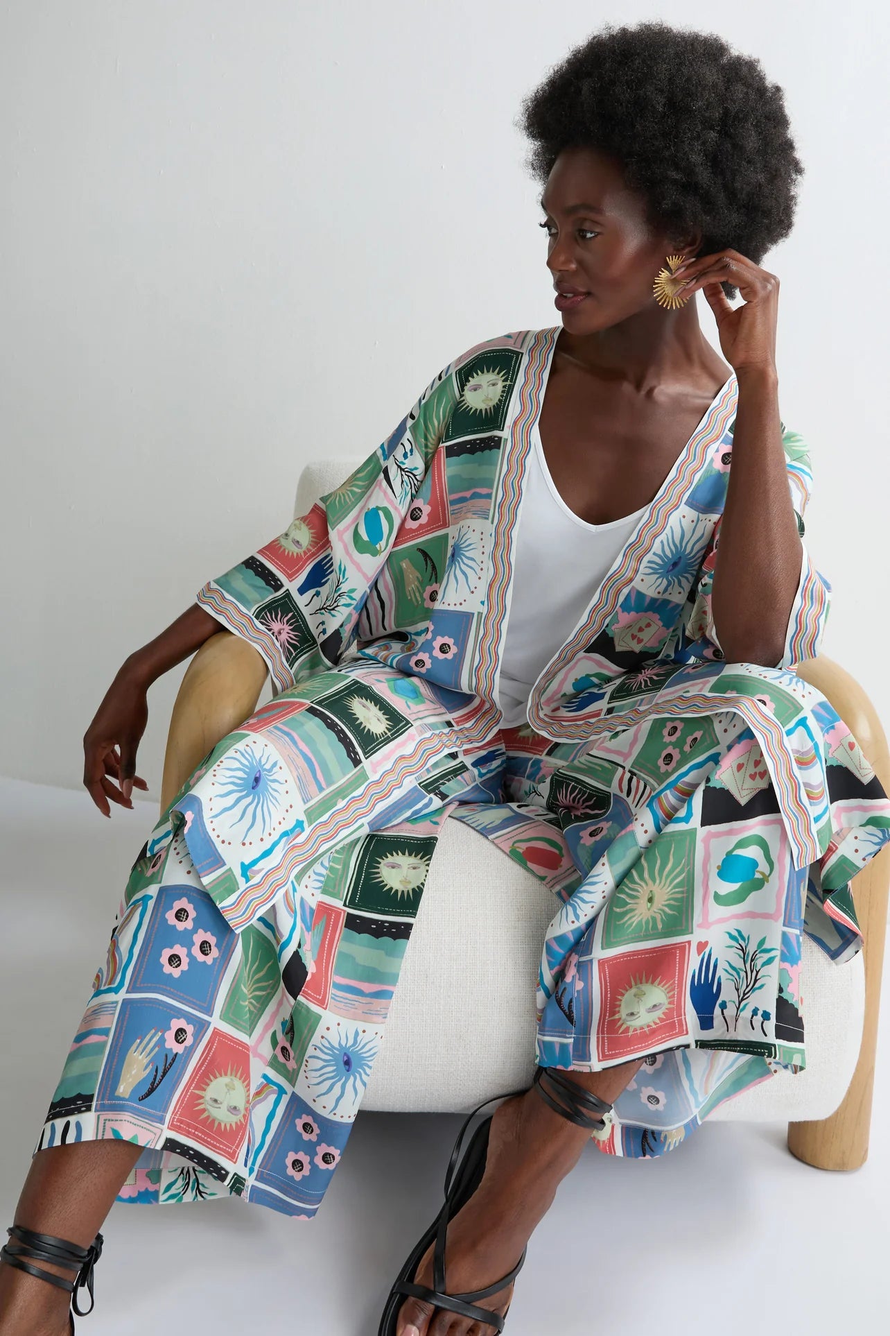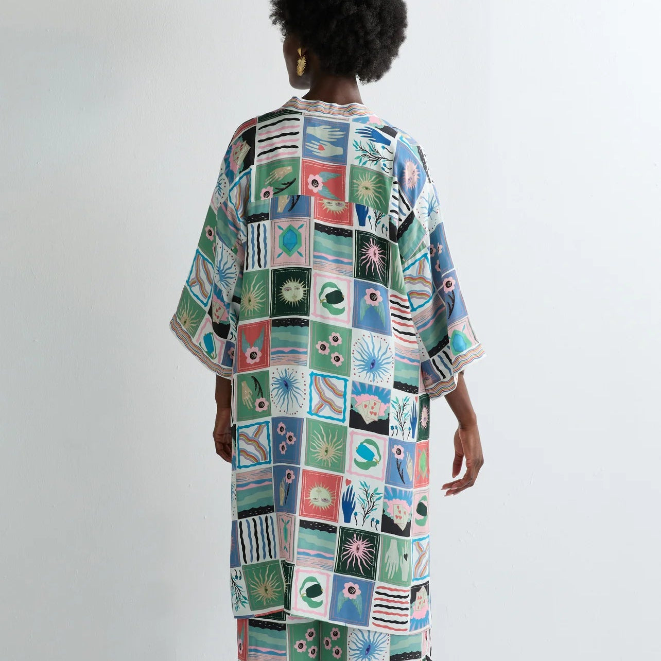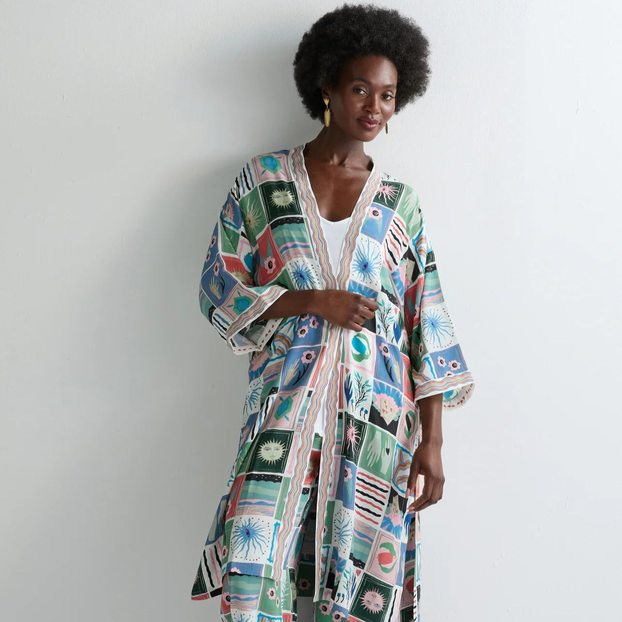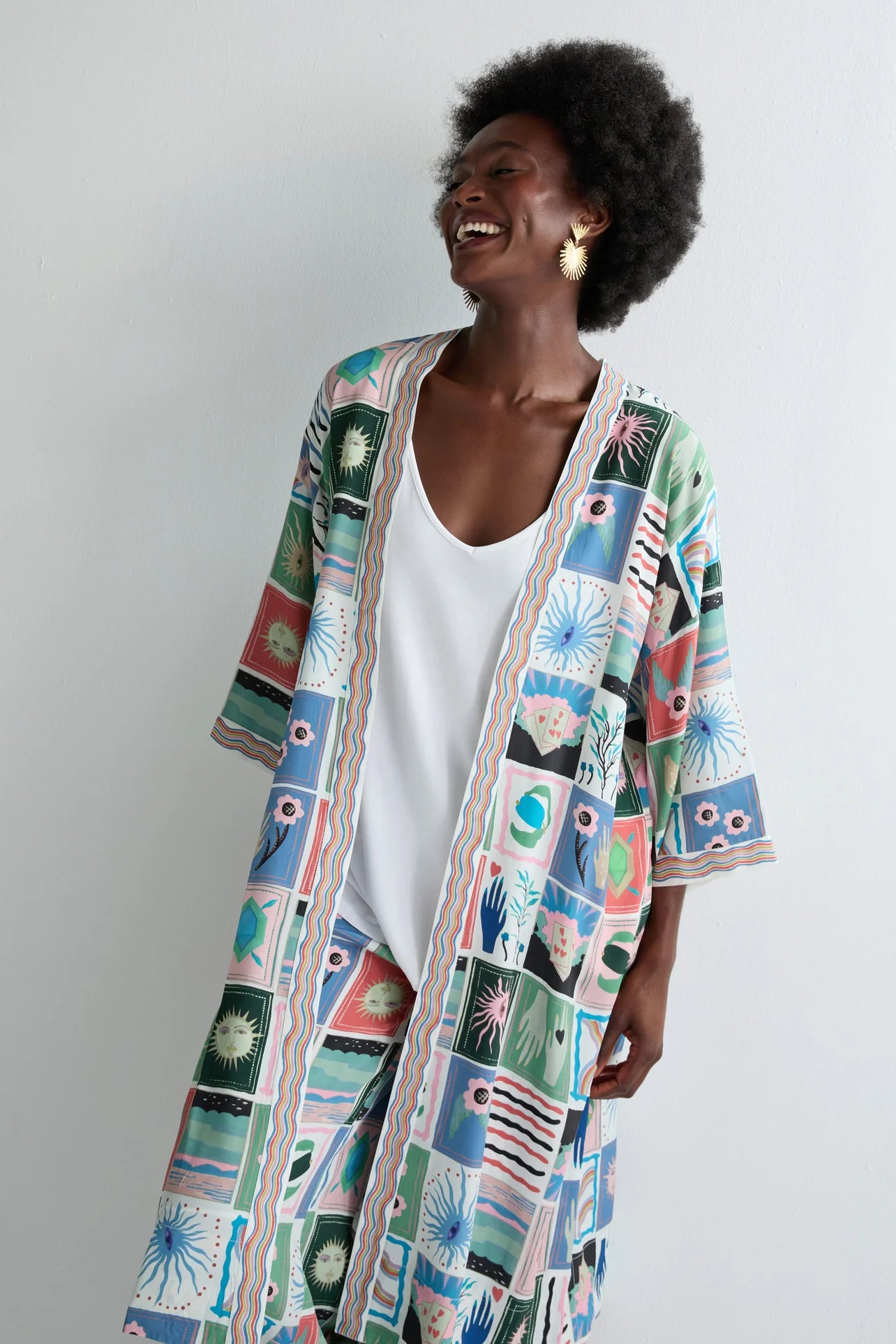 With its open shawl collar, wide 3/4 length sleeves, and breezy side splits, the kimono drapes effortlessly over anything and everything. The silhouette is fluid, the vibe is free-spirited, and the styling potential? Endless. Throw it over a simple dress, pair it with the matching collage trousers, or layer it over swimwear.