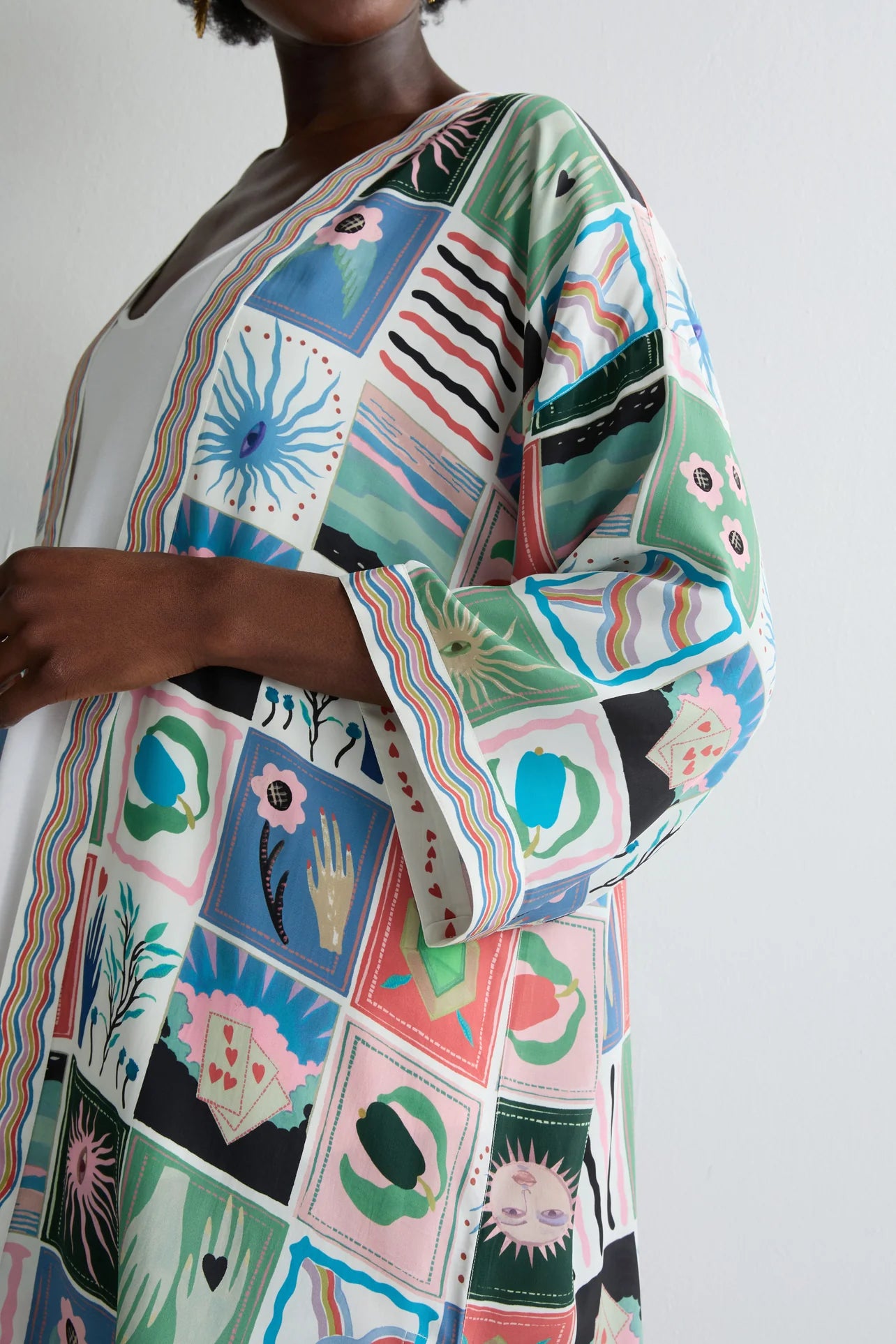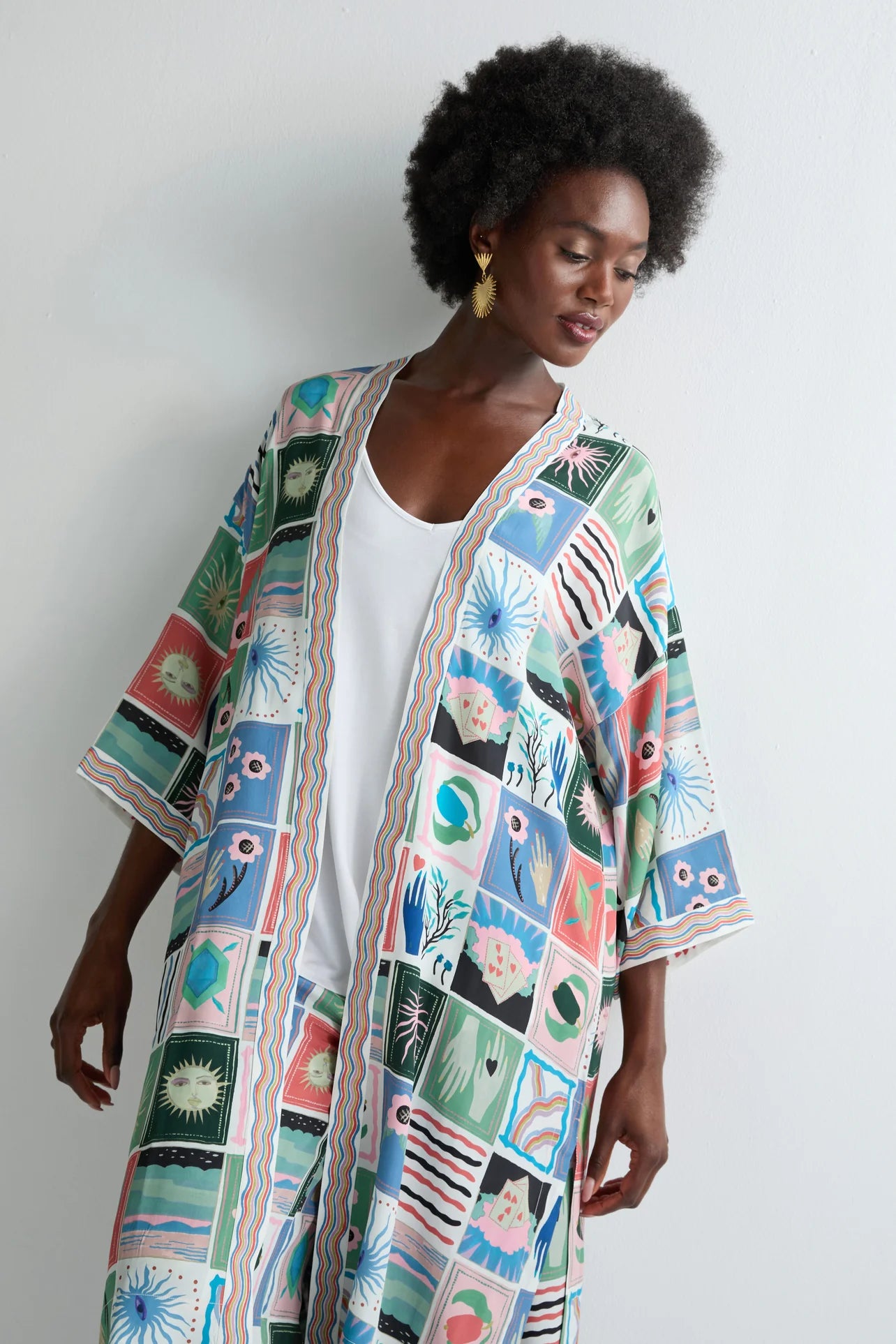 Wrap yourself in wanderlust with the Mystical Collage Kimono – a dreamy layer that feels like a postcard from another realm. Adorned with hand-painted symbols inspired by mystical motifs and holiday mementos, this flowing piece captures the essence of summer nostalgia. Showcasing a border print on the front edge and cuffs that features a flowing rainbow of colours on the outside, and scattered hearts on the inside - inspired by motifs from the main print, adding a playful twist to every gesture.