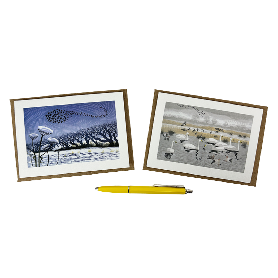 This beautiful set of notecards, are reproduced by Niki Bower from her original prints 'Snow Starlings' and 'Seven Swans'. They are perfect for gifts or for sending thank you notes.