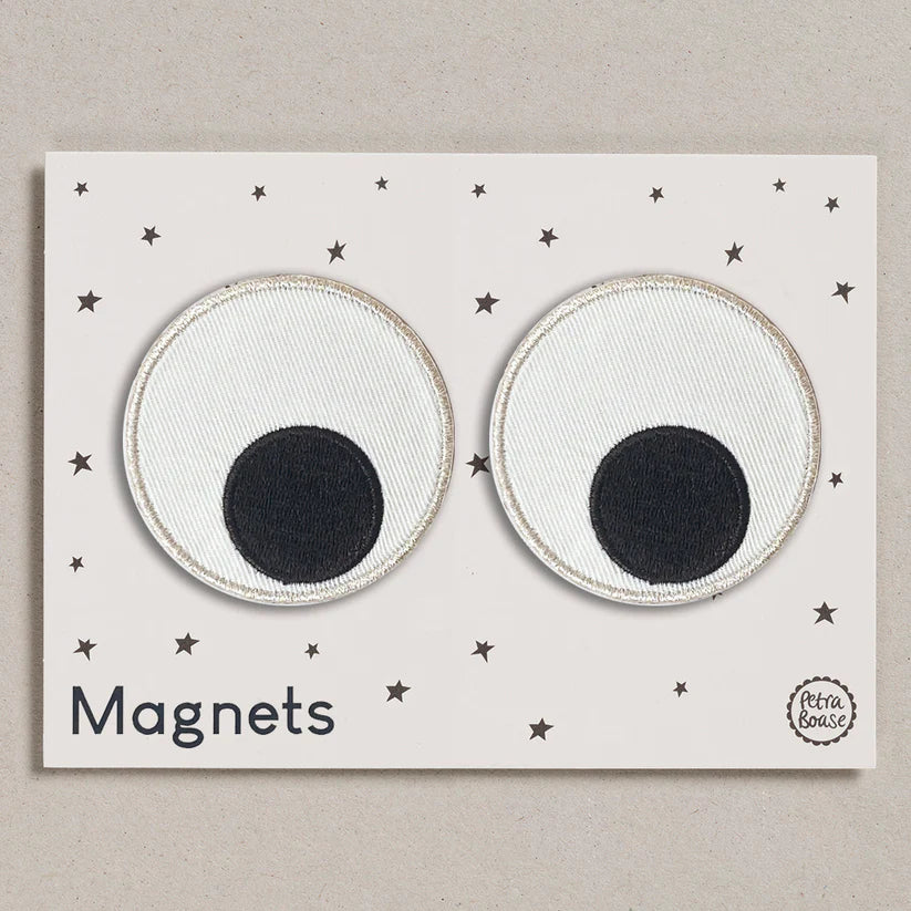 A pair of cheeky googly eye magnets to follow you around your home or office! Embroidered on white fabric edged with metallic silver stitching. Magnetic rubber backing.