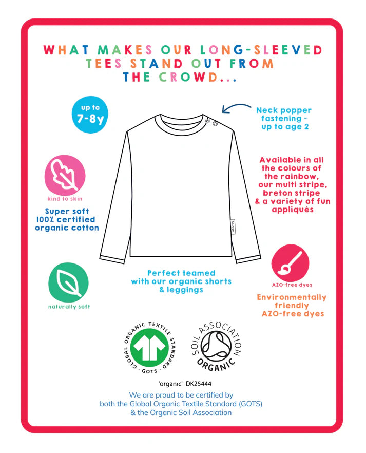 Colour pop! A beautifully simple brilliant red long-sleeved t-shirt made from super soft 100% certified organic cotton. Our plain range looks fantastic under our cord dungarees and dresses! These long-sleeved tops are so good that we've made one in every rainbow colour.