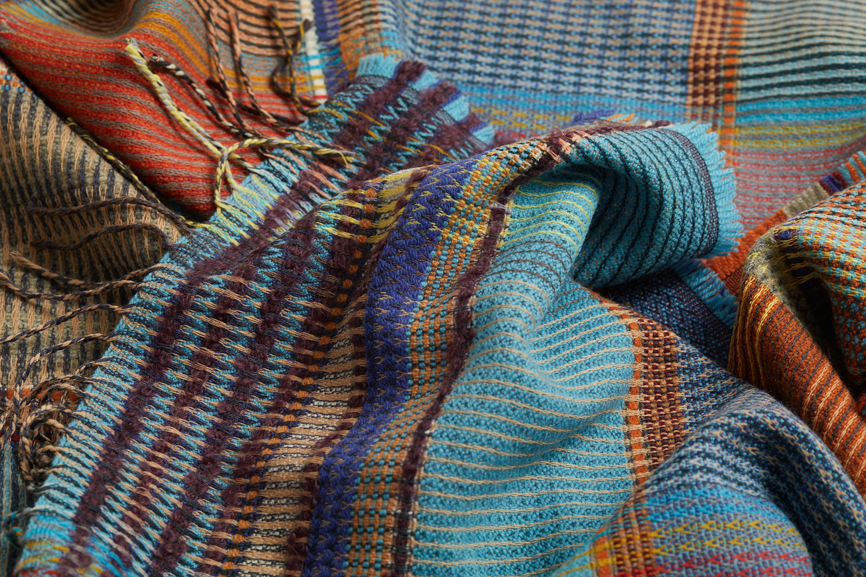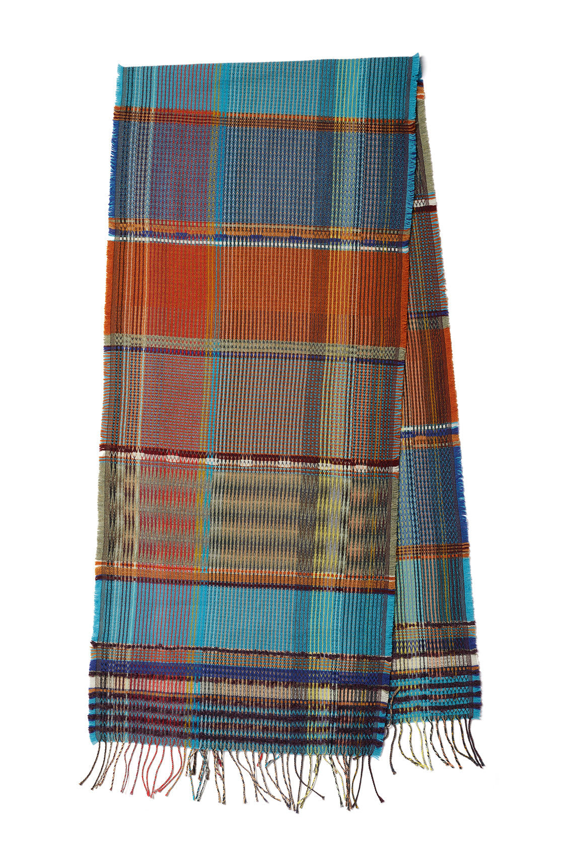 The Ortensia Wrap is woven in fine lambswool with a soft mohair border, combining textured stripes, checks, and grids. Subtle woven patterns in interchanging colours add depth, finished with tassels.