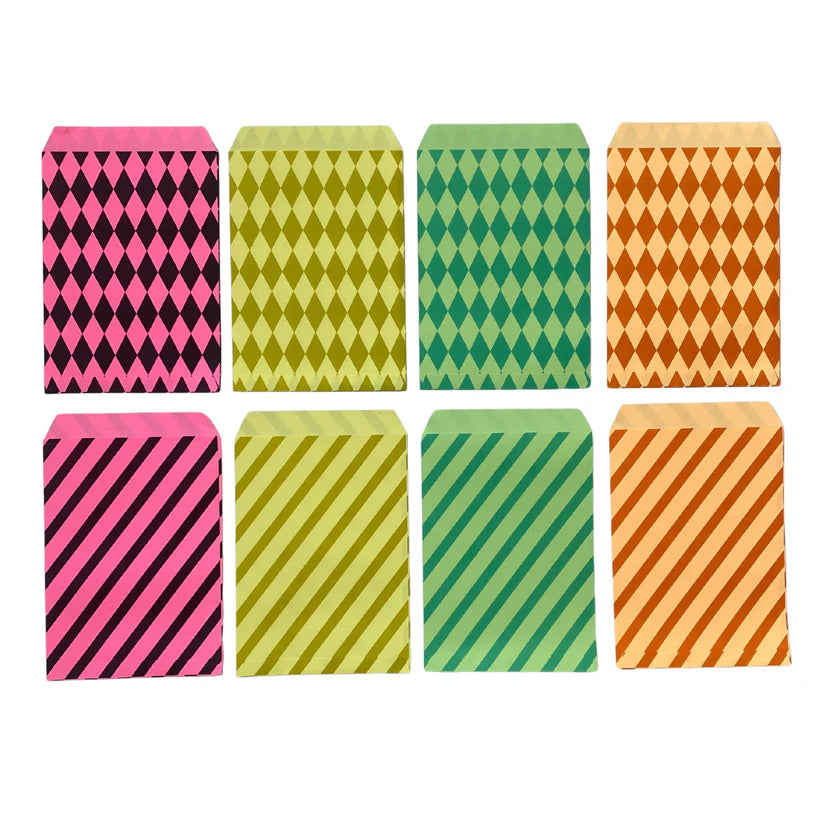 A pack of 24 mixed harlequin & stripe colourful paper bags. Perfect for party favours and small gifts or paper crafting projects.