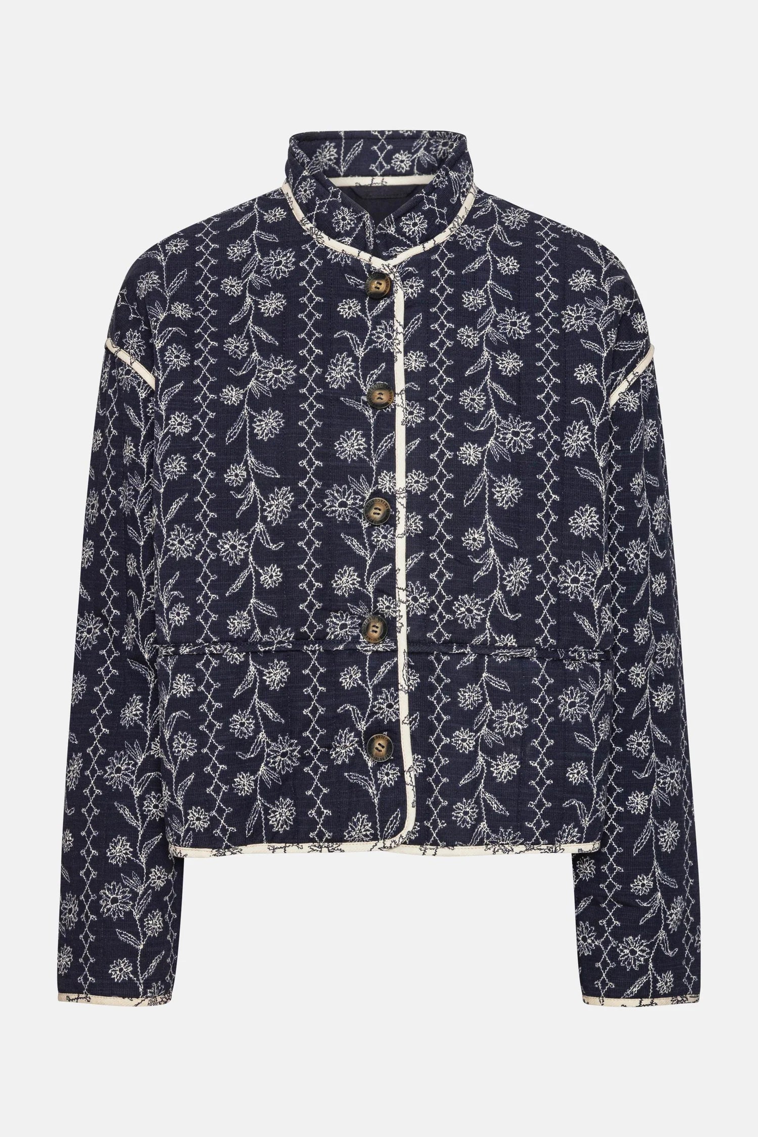 This short, boxy quilted jacket features soft stitched padding and a small mandarin collar. It is adorned with contrast-colored trim at all hems, hidden front pockets, and logo horn buttons for the front closure.