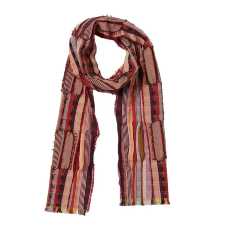 A soft woven scarf featuring bold stripes and a colorful, delicate striped border.