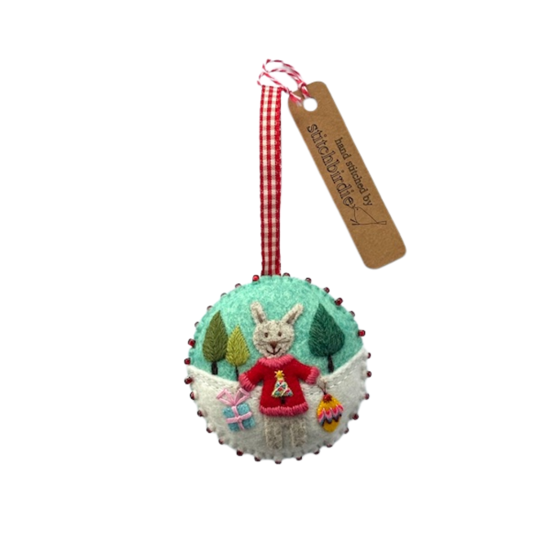 A beautiful hand embroidered Christmas decoration, featuring Robbie the Rabbit, dressed in his festive red jumper, delivering Christmas gifts to friends, across a snowy landscape.