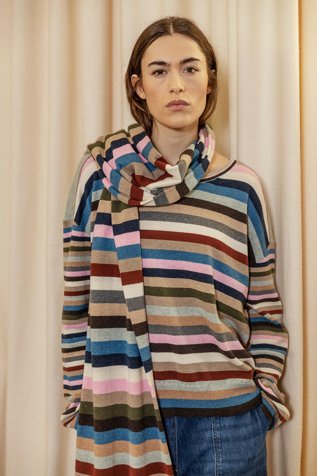 Safir is a soft knit blouse with a clean silhouette. Crafted from a lightweight blend of organic cotton and extra fine wool. The design features a wide round neckline, dropped shoulders and a relaxed body. Ribbed cuffs and hem give it subtle structure, while the fine knit adds gentle drape.