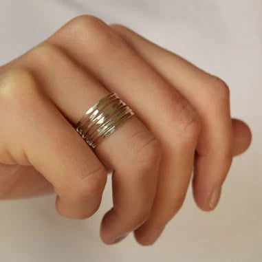 Skinny stacking ring set in sterling silver. Each ring has been given a hammered finish to catch the light. The seven bands are linked together by a hammered silver link, this can be worn to the front for added interest or tucked to the back to give the impression of the bands being loose.