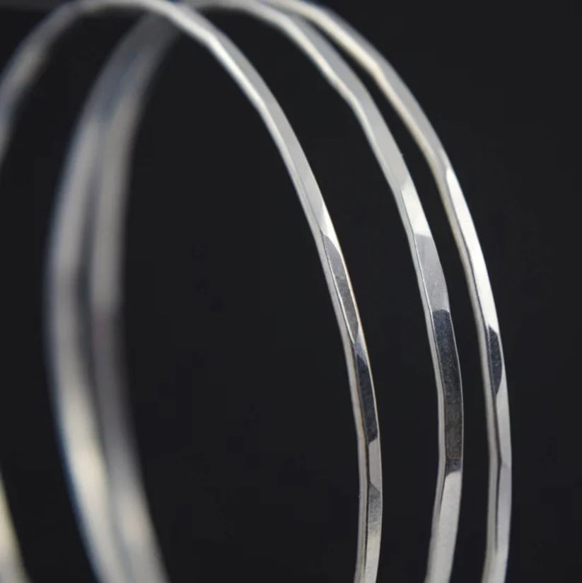 The slim design of these bangles offers a delicate, elegant touch while still catching the eye as the hammered surface of the silver reflects light and creates a subtle sparkle.