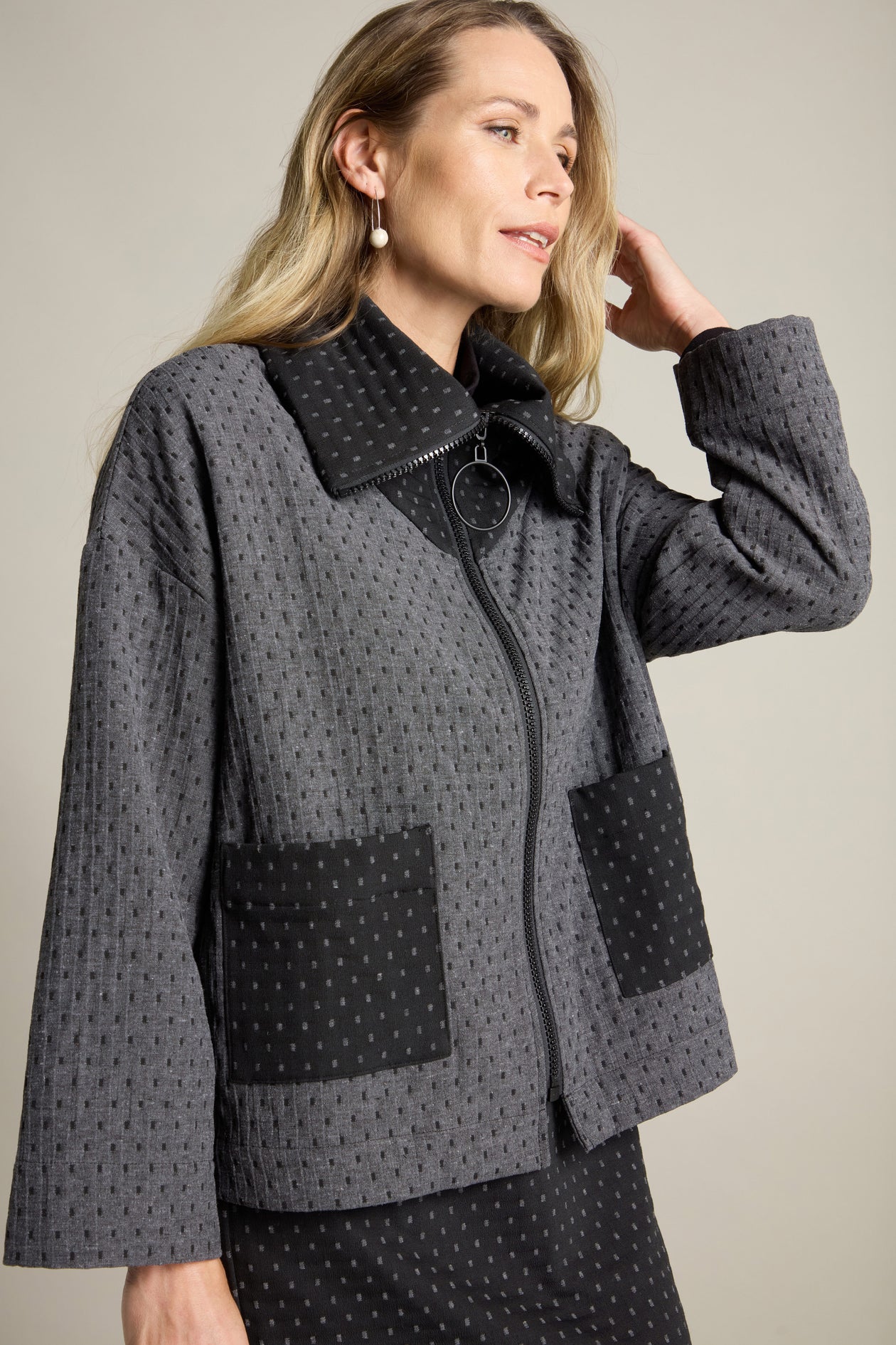 The square jacquard pattern gives the jacket a distinctive, textured look, while the boxy fit ensures a relaxed yet structured silhouette that is both stylish and versatile. Perfect for layering, the full-length sleeves and high funnel neck provide coverage and warmth, making it an ideal choice for transitional weather or cooler days.