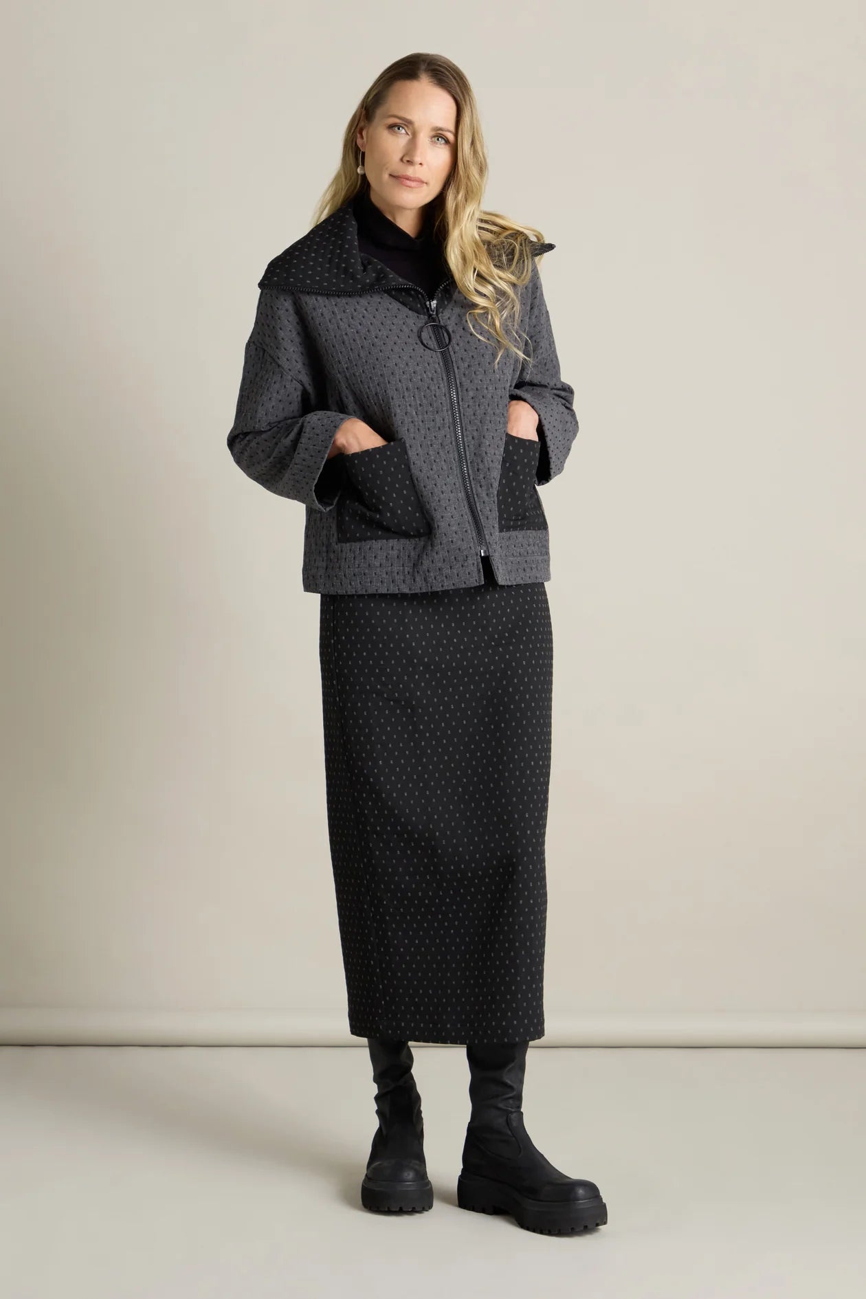 Step into contemporary style with the Sahara Square Jacquard Boxy Jacket, a statement piece that blends modern design with luxurious comfort. Crafted from double-faced jacquard in a chic black and grey mix, this jacket offers a striking tonal contrast with two front patch pockets that adds depth and dimension to your wardrobe.