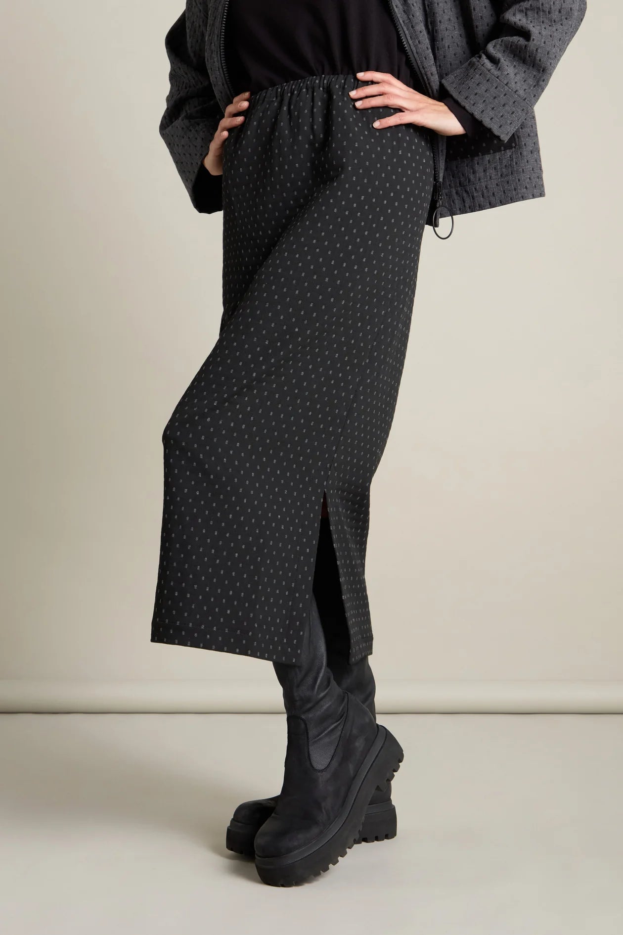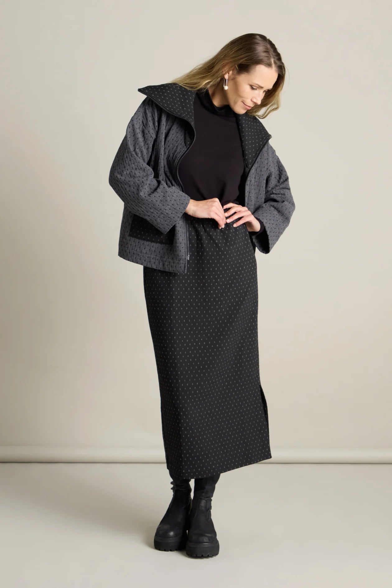 The Sahara Square Jacquard Tube Skirt is a modern essential that combines sleek design with striking texture. Crafted from double-faced jacquard fabric in a sophisticated black and grey weave, this skirt offers a contemporary look with a touch of elegance.