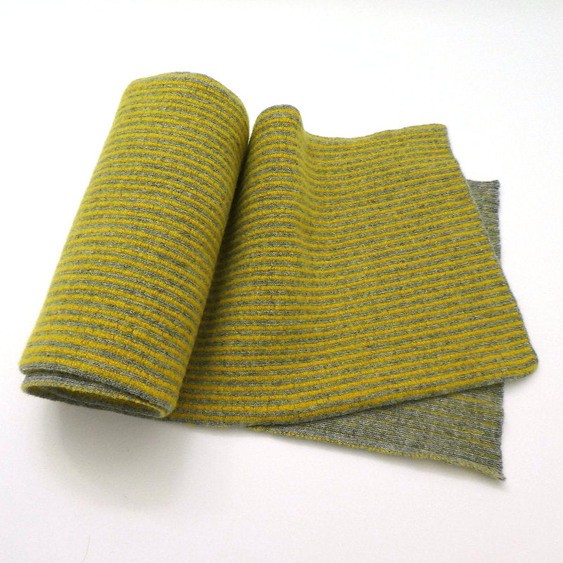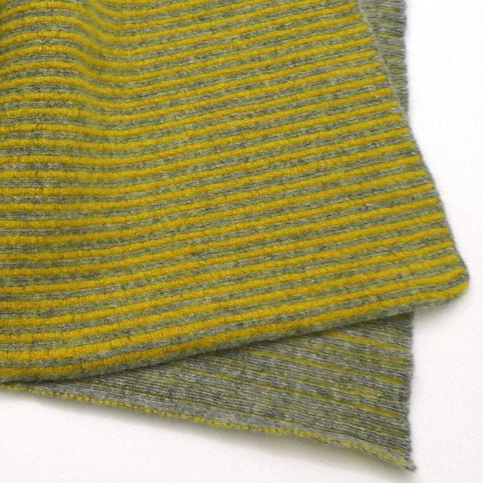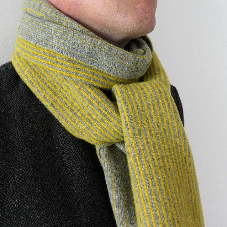 This textured vertical stripe scarf has been knitted with 100% luxury soft lambwool. Each item is hand produced on an industrial knitting machine and hand finished to create fine details and excellent quality.
