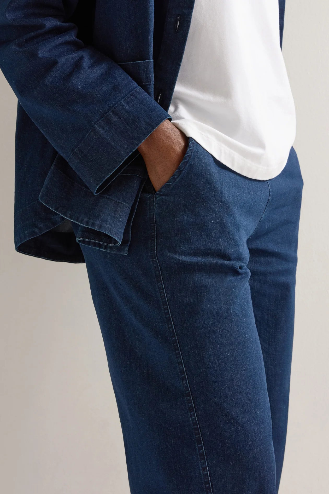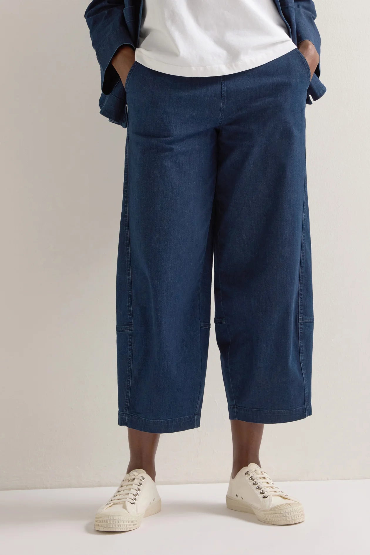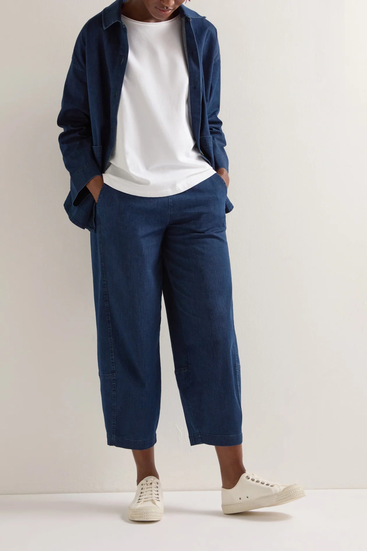 Update your denim for the new season with these effortless bubble trousers. Crafted from cotton-rich fabric with just the right amount of stretch, you can expect the relaxed aesthetic of denim with a polished finish. The trousers feature an elasticated waist with a smooth front and gathered back, two convenient side pockets, and a flattering flared shape falling to the ankle.