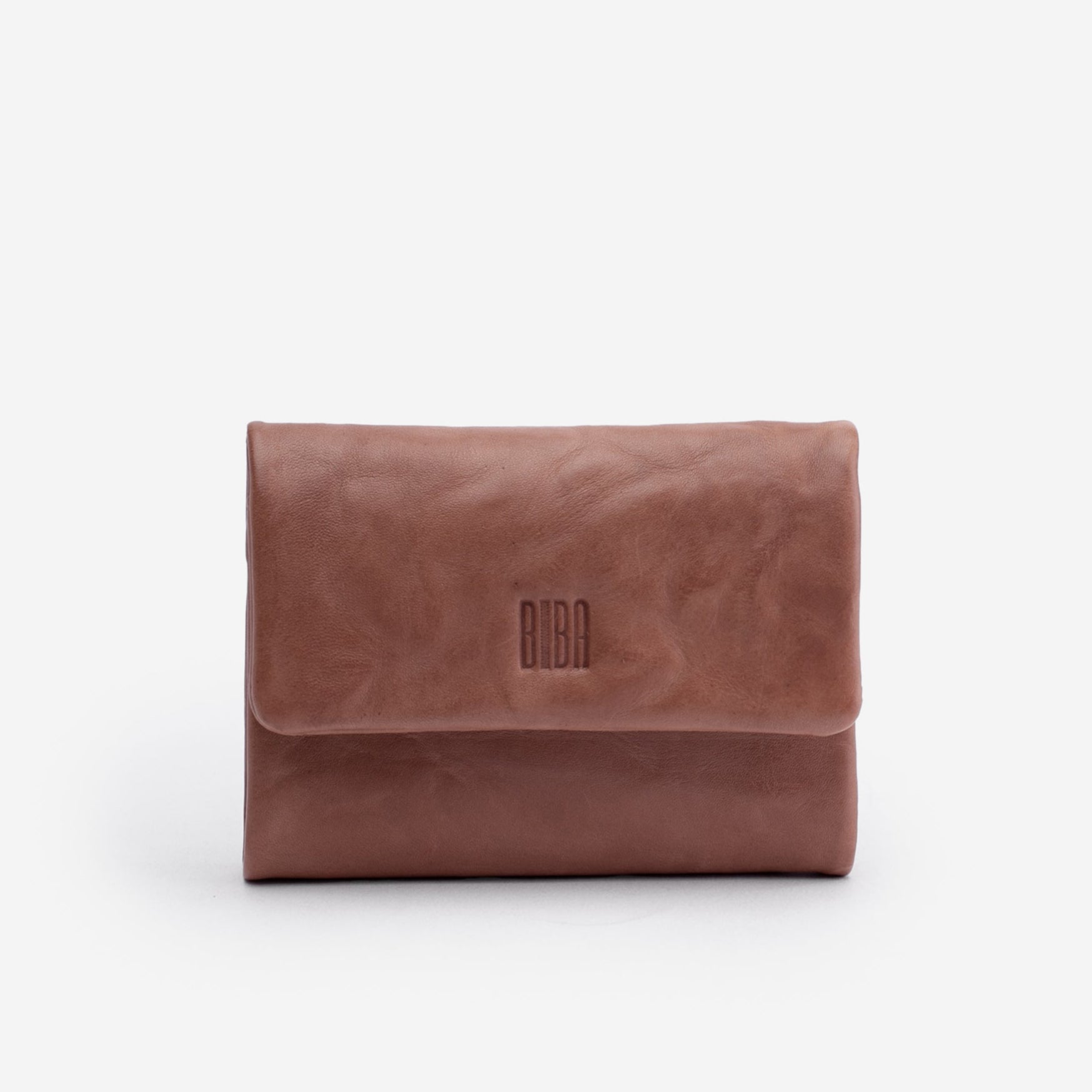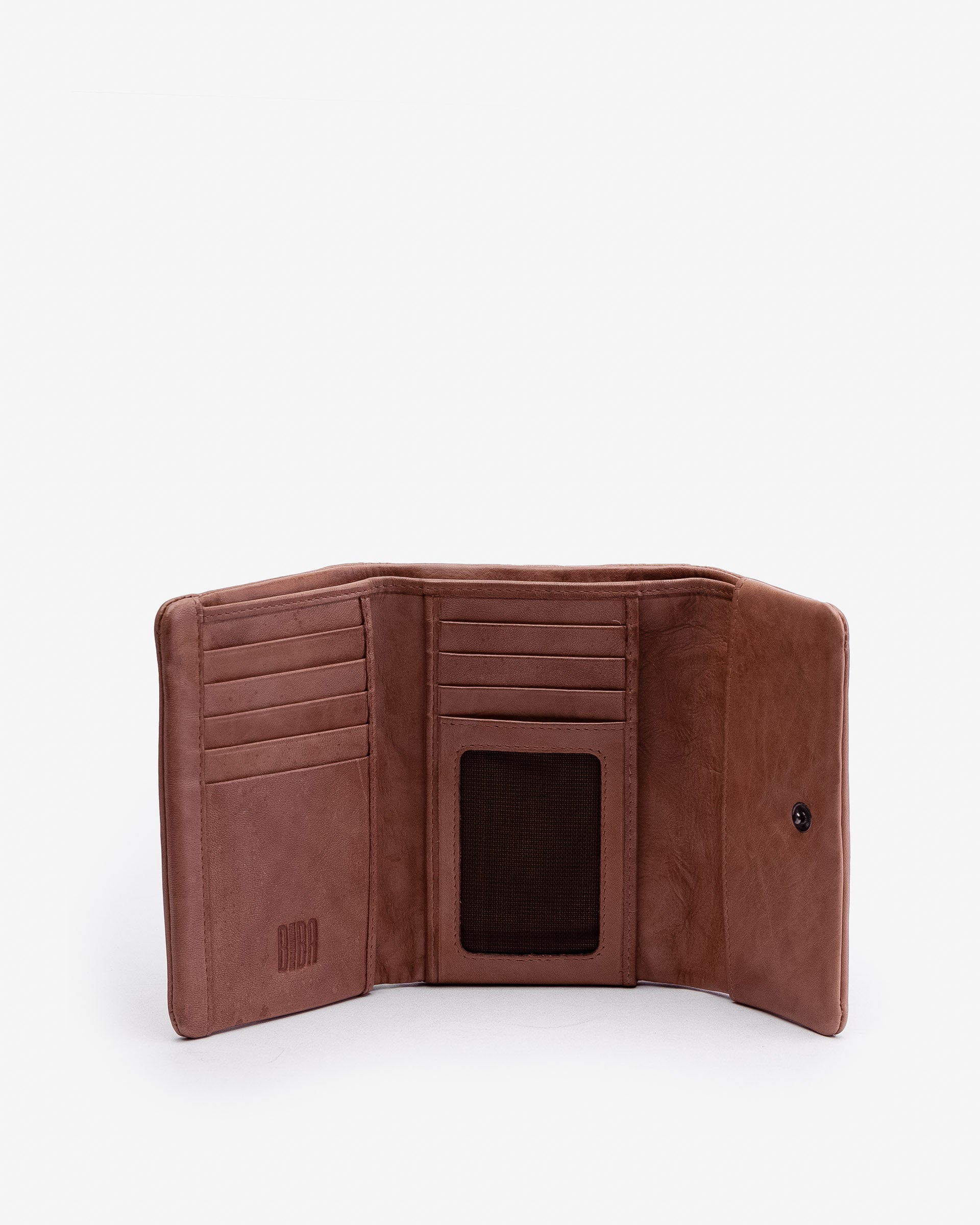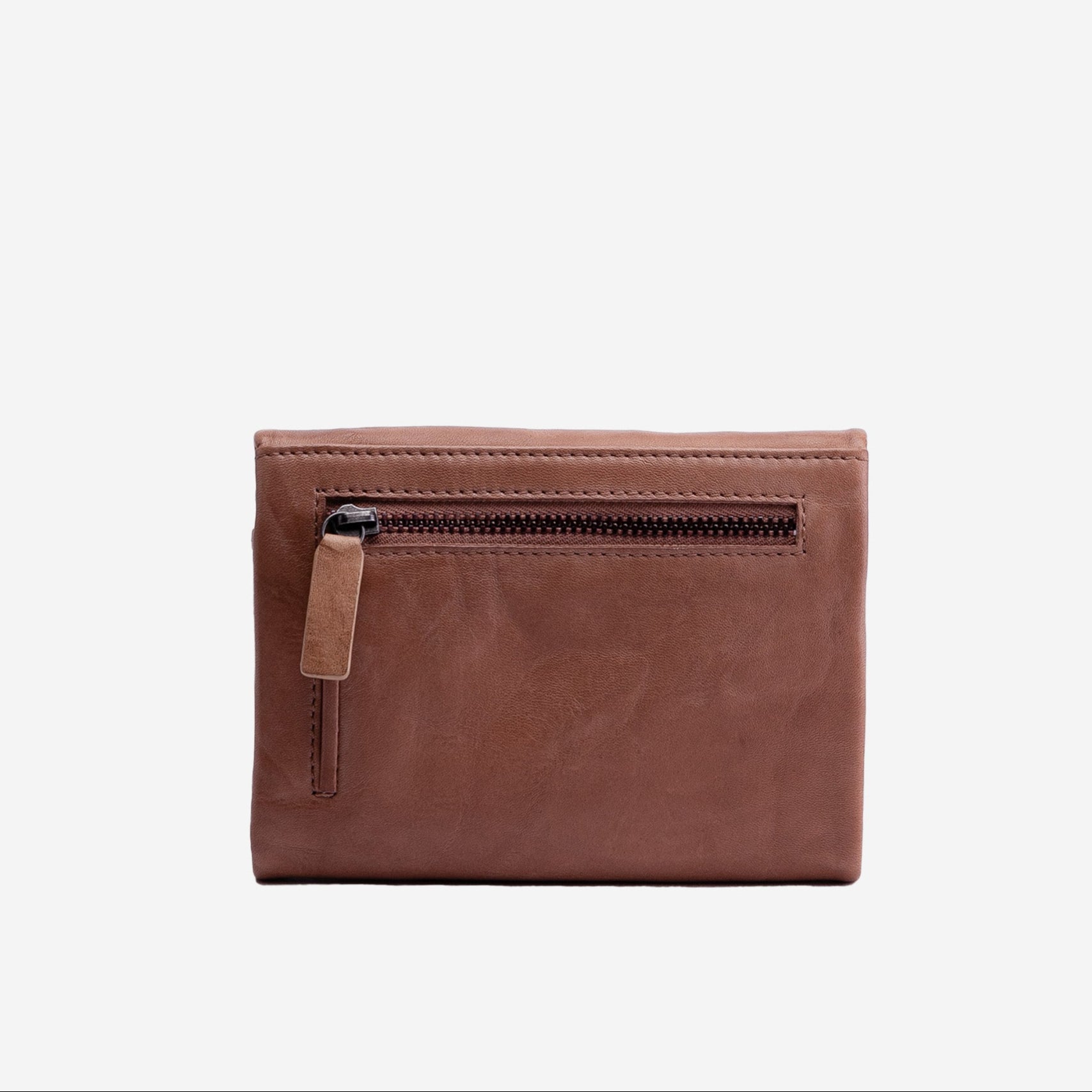Small wallet made of natural leather. Multiple compartments for cards, bills, and coins. Zippered pocket. Flap closure with snap button.