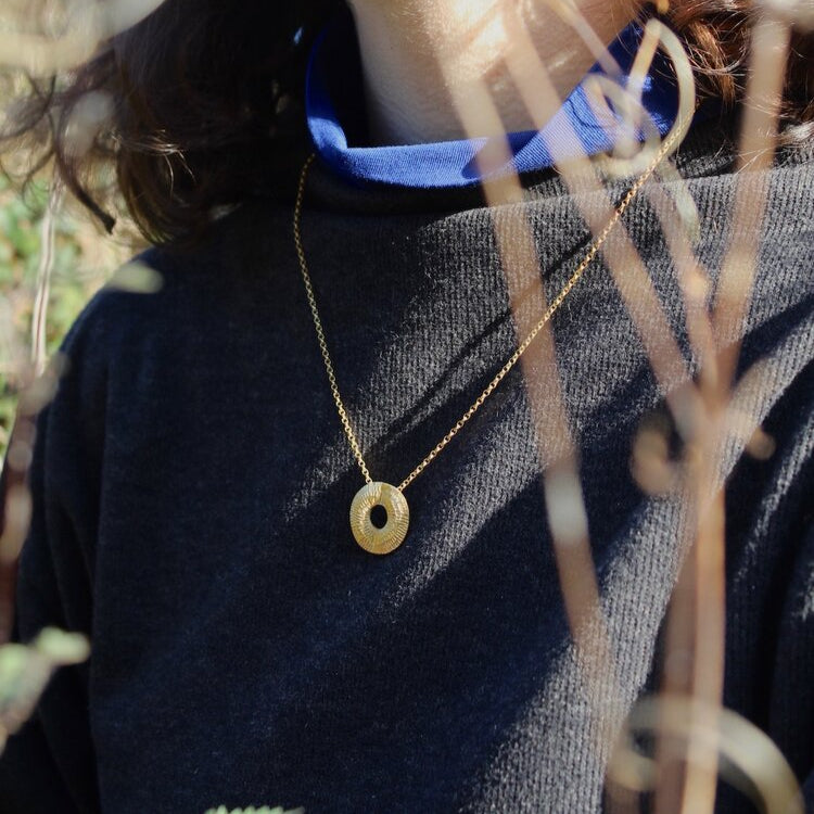 The circular shape references the concentric circles of stone carvings found at sacred sites. The tactility and repetition of the design is meditative and comforting to wear.