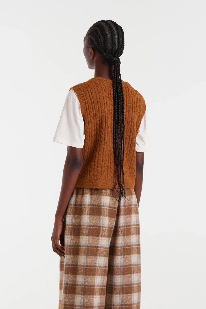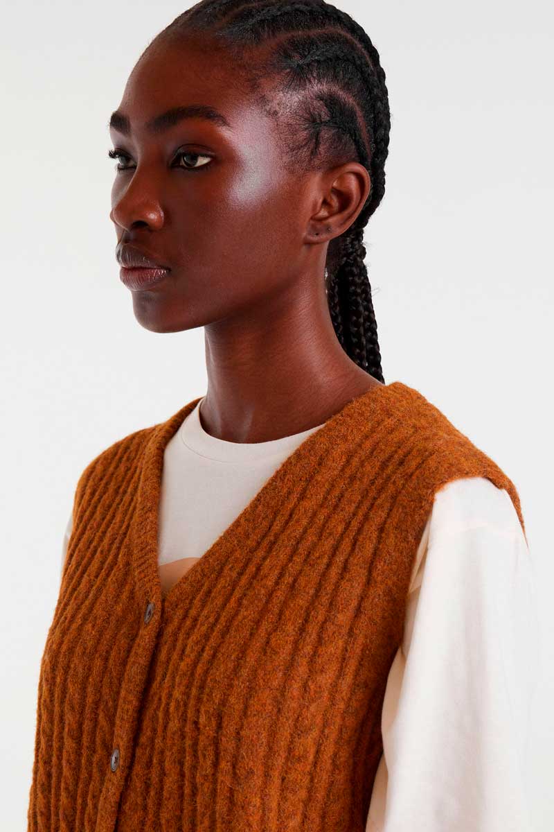 Brown knitted vest with a V-neck and sleeveless design. Button-front closure with ribbed details. The model is 178 cm tall and is wearing a size S.