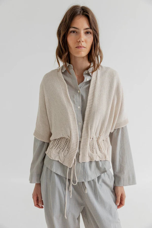 Vinnie is a short-sleeved summer cardigan with a deep V-neck and drawstring waist. The top is crafted in a soft textured knit with openwork details and wide rib trims.