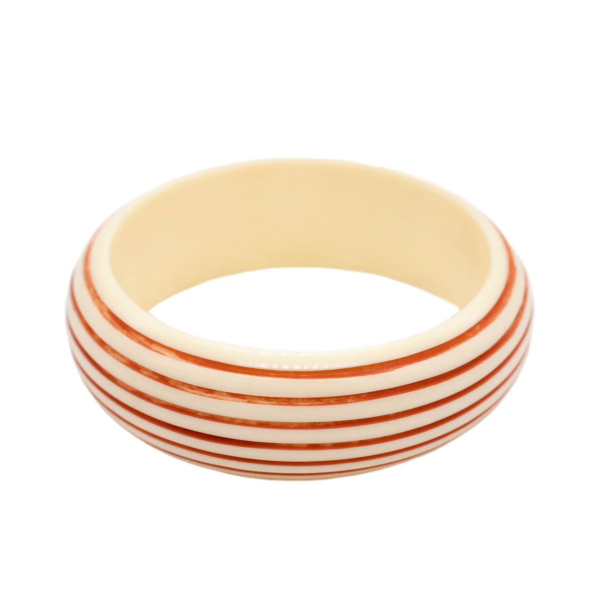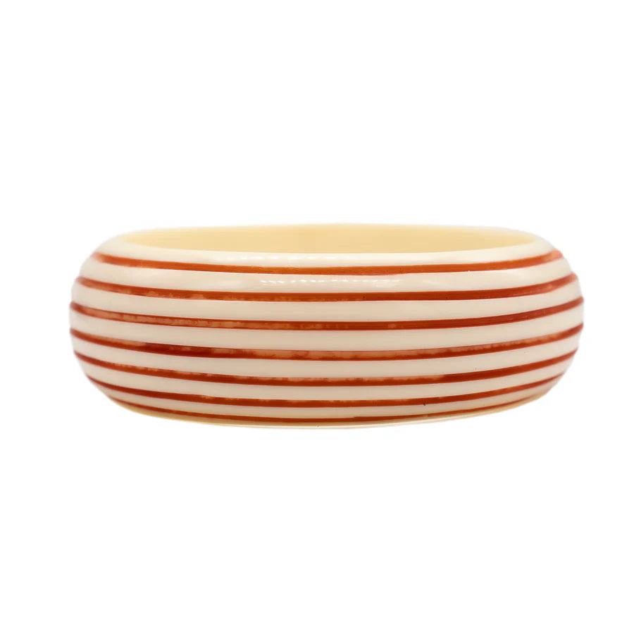 This statement bangle provides an eye-catching accent with its retro-inspired Ivory and Red resin stripes. The graphic design adds texture to any look and is perfect for any occasion.