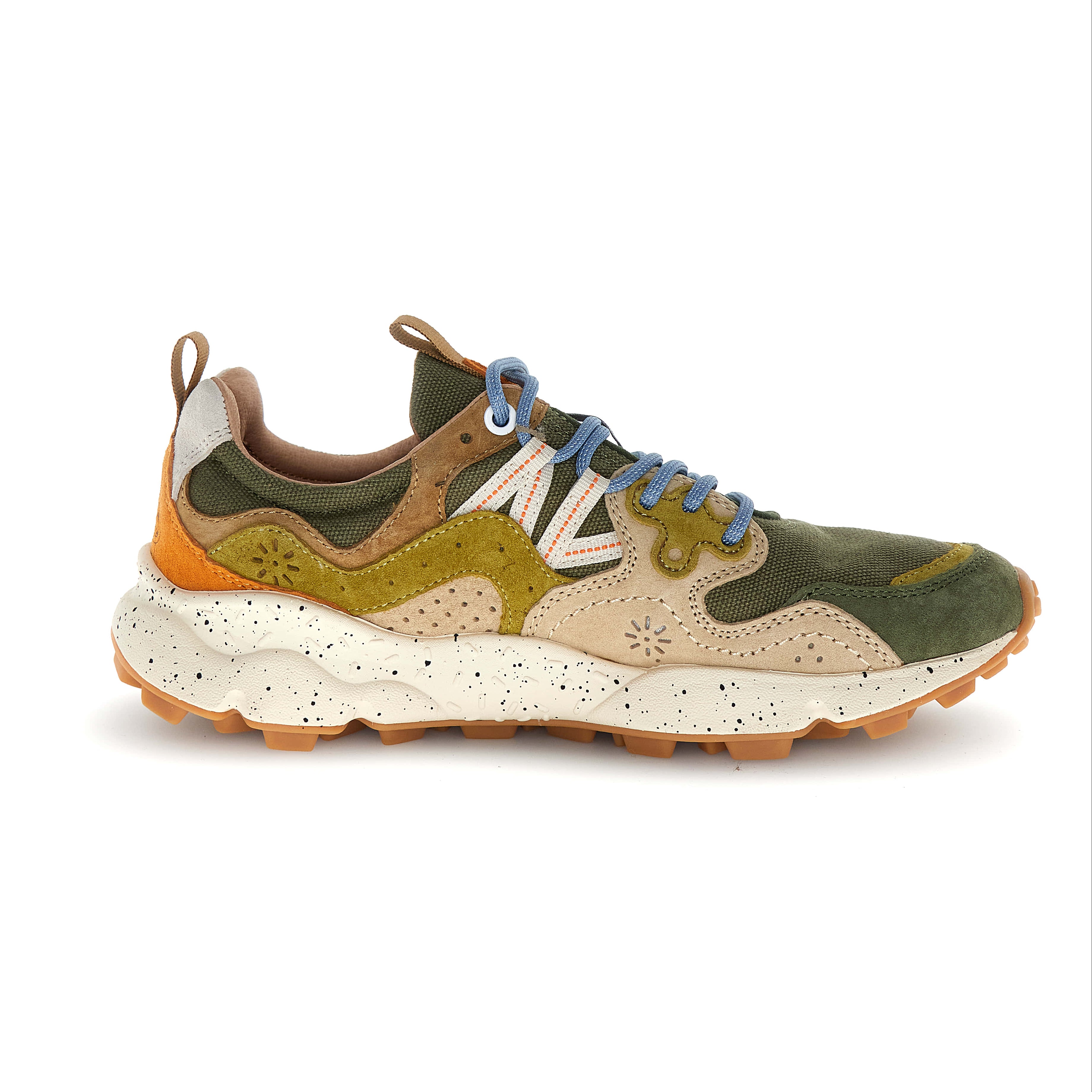 The YAMANO 3 collection has been designed to convey the uniqueness of Flower Mountain, its love for nature, and its commitment to high-quality craftsmanship. The brand's outdoor spirit is captured through details inspired by the shapes and cycles of nature: layered design elements, dotted lines tracing gentle curves, hiking laces, and iconic leather eyelets. The result is an iconic sneaker that embraces the foot, while the lines, embroidery, and hand-stitched upper showcase a dedication to high-quality craftsmanship and Japanese inspiration.